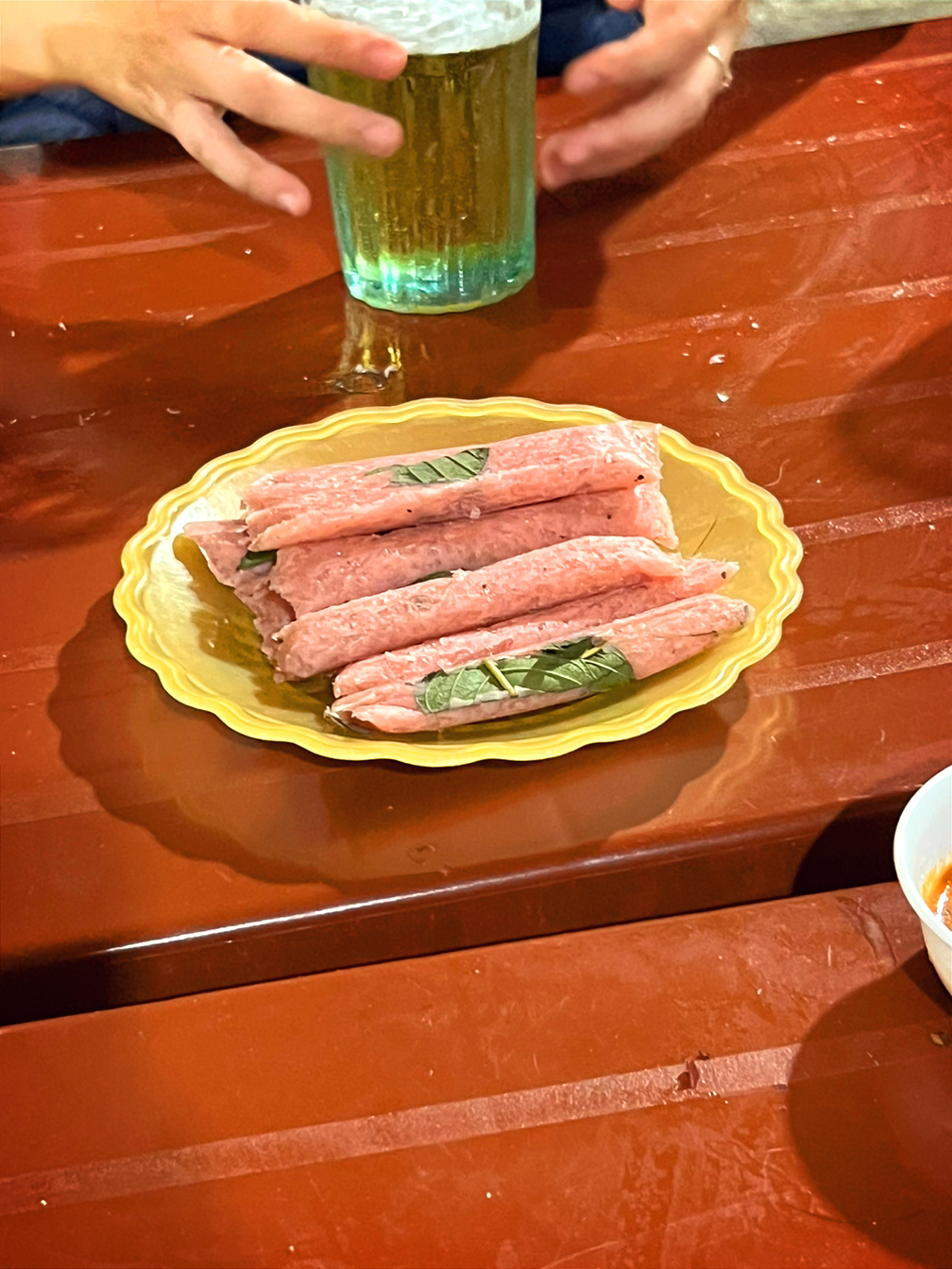 뒤에 보이는 요 핑크색의 음식은 넴 쭈어(Nem chua) 자신 있게 간판 음식으로 소개하지 않은 이유는 나의 입맛에는 조금 어색했던 진짜 로컬음식이었기 때문이다.