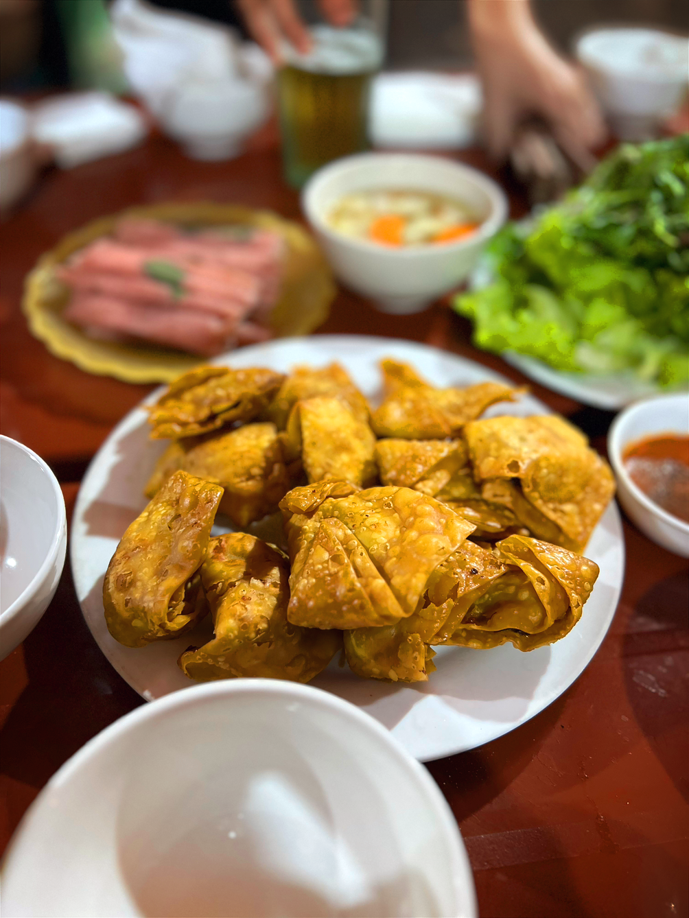 한입 물어 속을 들여다보면 다진 고기, 버섯 그리고 양파와 당근이 알차게 자리하고 있다. 우리가 흔히 분짜와 함께 먹는 넴의 속과 유사하다고 보면 된다. 그러나 넴과 달리 밀가루로 바삭하게 튀긴 만두피가 넴보다 더 중독적인 식감을 준다.