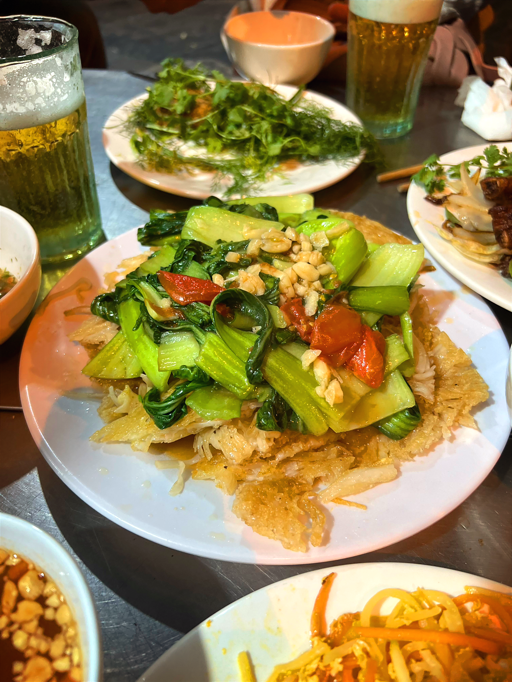 한국의 맛을 베트남에서 느껴 깜짝 놀랐다. 청경채 가득 올라간 요리의 이름은 포 싸오. 밑에 깔려있는 것은 바삭하게 튀긴 쌀국수 면, 즉 포인데 우리나라의 누룽지와 식감이 굉장히 유사하다. 둘 다 같은 쌀이라서 그런지 면과 밥의 차이가 있음에도 거의 흡사했다.