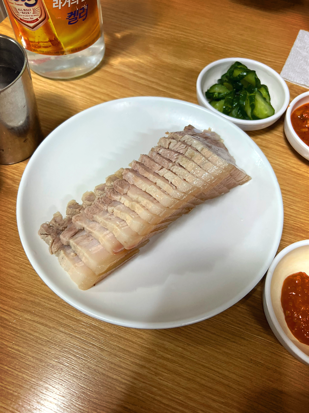한 김 식혀 나와 쫀득쫀득한 제육은 끝부분의 쫄깃한 껍데기, 비계 그리고 살코기가 완벽한 조화를 이룬다! 마늘을 곁들여 함께 주는 소스에 한번, 김치에 싸서 한번, 그리고 먹고 나서 소주 한잔 들이켜는 걸 추천!