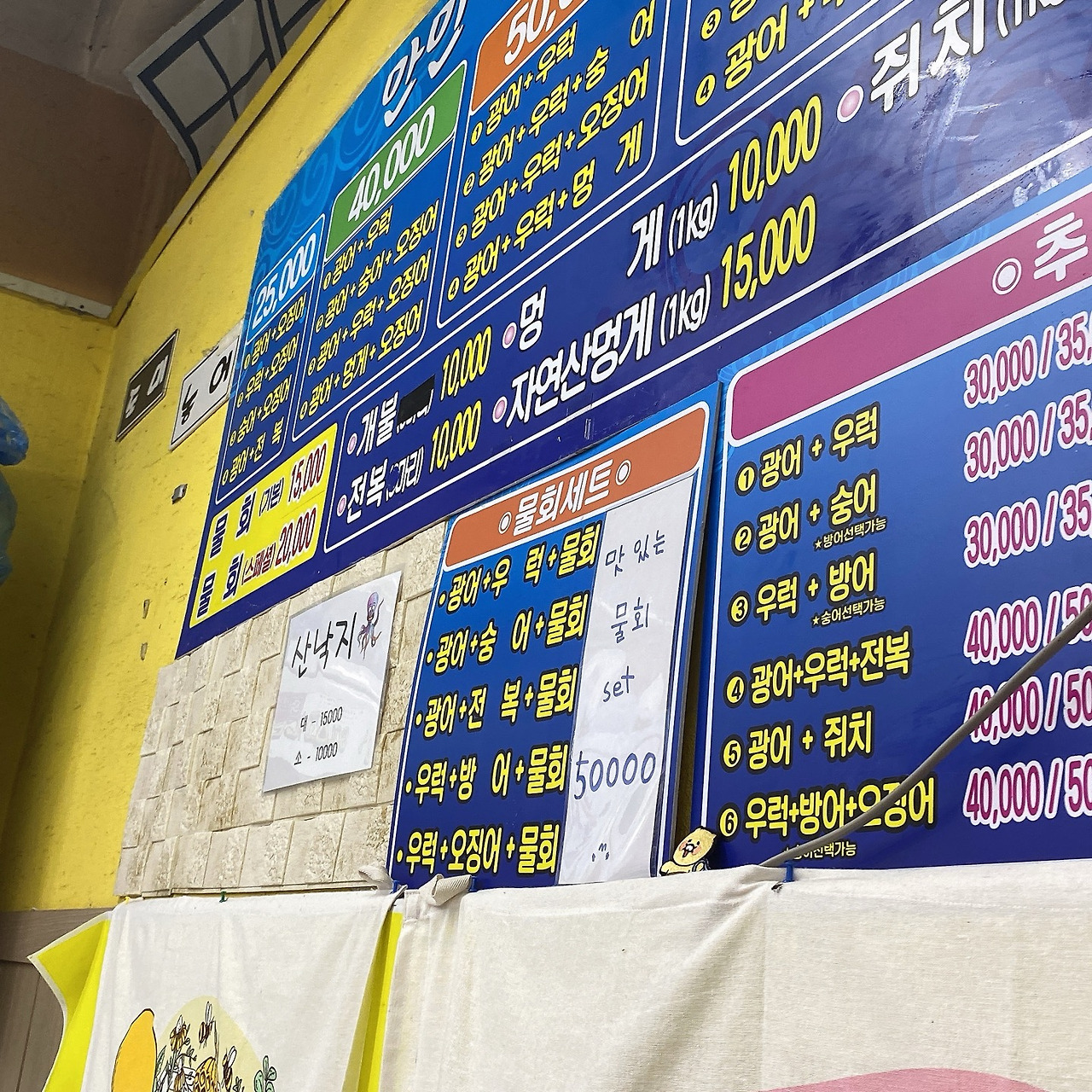 어시장을 조금 돌아다니다 어디로 들어갈지 갈피를 못 잡다가 뭔가 상냥해 보이는 사장님이 서 계시던 곳에 이끌려 들어간 가게였다. 가격이 그렇게 싸다고 느껴지진 않았지만, 더 돌아다니기에도 힘들어서 바로 들어갔다. 목표는 광어와 오징어!