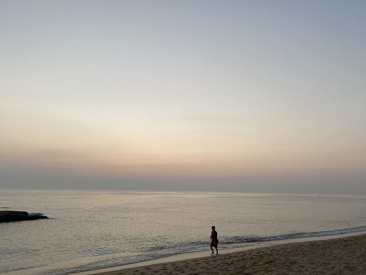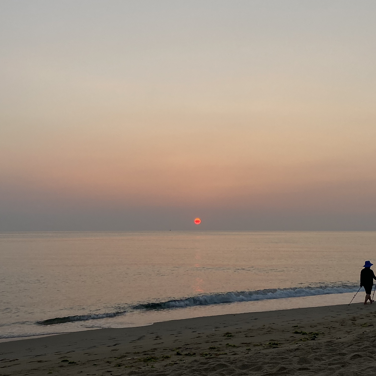 이른 시간임에도 해변가엔 바다산책과 일출을 보러 온 사람들로 꽤 북적였다. 그러나 소란하지 않다. 파도의 경계를 따라 맨발로 열심히 파워워킹을 하는 분들도 꽤 볼 수 있다. 역광으로 비친 그들의 모습에서 하루를 시작하는 활기참을 선물 받은 듯하다.