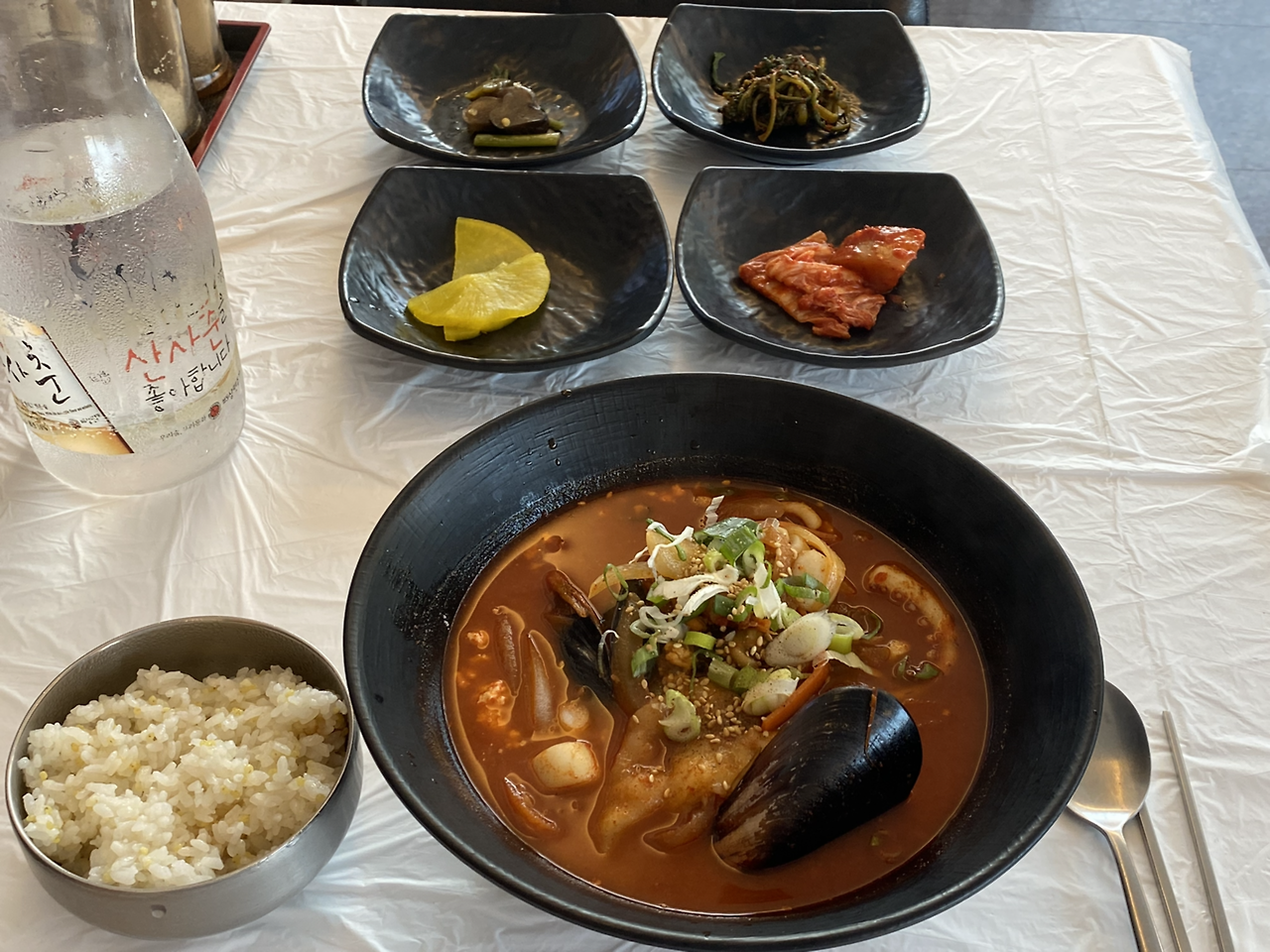 오전 6시부터 오픈한 식당을 찾다 보니 순두부마을 쪽에 ‘솔향초당순두부’라는 곳이 있었다. 대학생 때 혼자 여행 왔을 때는 담백한 초당순두부만 먹어봤었는데 이번에는 얼큰한 짬뽕순두부를 먹고 싶어서 택한 곳이었다. 활짝 열려있는 문으로 들어가니 순두부를 닮아 부드러운 미소로 반겨주시는 사장님이 계셨다.