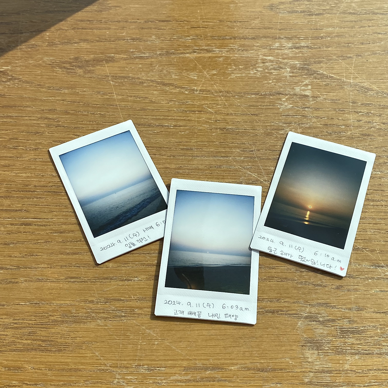 테이블 위에 오늘 아침에 찍었던 일출 폴라로이드 사진들을 나열해 본다. 그리고 볼펜으로 날짜와 함께 간단한 기록도 남겨뒀다. 분명 같은 장소였는데, 단 몇 분의 시간 변화만으로도 이렇게 다른 빛이 담길 수 있다는 것에 놀랐다.