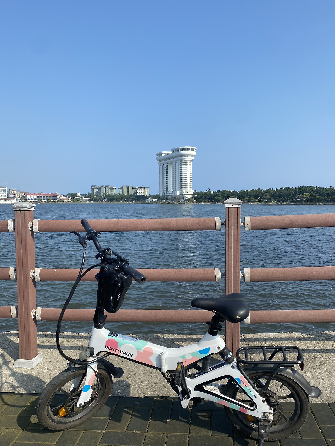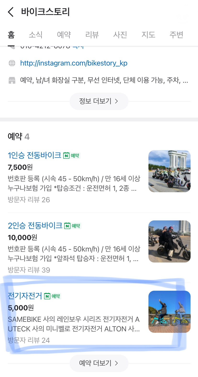 딱 두 정거장을 지나 경포해변 정류장에서 하차했다. 내리자마자 노란색 간판으로 대문짝만하게 '바이크스토리' 라고 적힌 대여점이 보인다. 넓은 경포호에서 전기자전거를 타며 시원하게 바람도 쐴 겸, 대여점으로 향했다. 대여소 앞에 다다랐을 땐 사장님으로 보이는 분께서 쪼그려 앉아 업무를 보시고 계셨다.