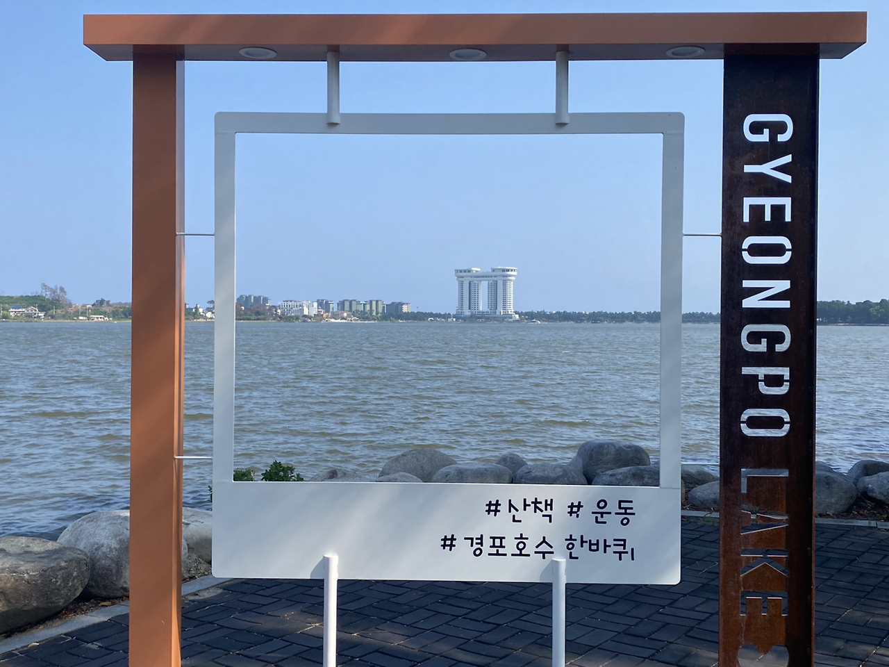 출발한 지 얼마 되지 않아 호수의 풍경을 담기 위해 잠시 멈춰섰다. 경포호의 시그니처로 스카이베이 호텔이 빠질 수 없다. 호숫가 사진에 새하얗게 걸리는 호텔이 마치 거대한 구름 덩어리 같다.