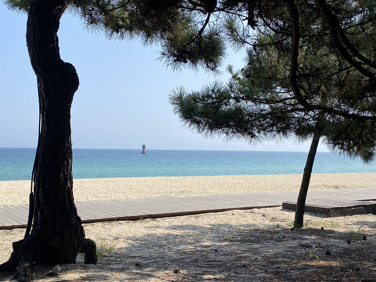 양산을 쓰고 걸어도 목과 팔이 너무 뜨거워서 해변 뒤쪽에 해송으로 그늘진 벤치에 앉아 잠시 열기를 식혔다. 가려는 식당이 오픈하려면 11시까지 기다려야 했기에 땀도 식힐 겸, 바다멍도 때릴 겸 앉았다. 주변의 데크에서 돗자리를 깔고 그 위에서 대자로 누워 휴식을 취하고 있는 사람들도 꽤 보였다. 멀리 반려견과 함께 산책을 하는 사람들도 보였다.