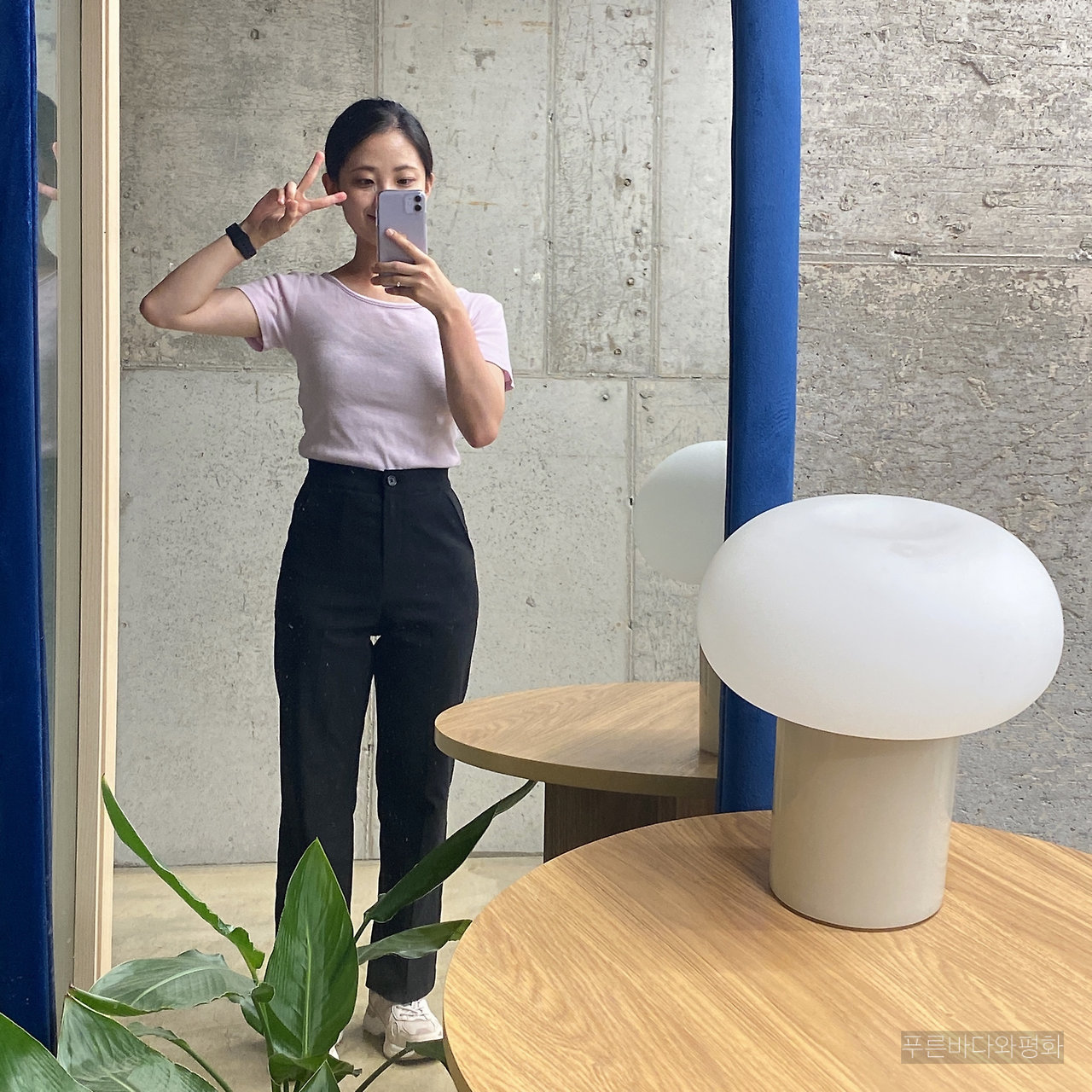로비로 내려와 가방을 잠시 소파에 내려두고 전신거울 앞에서 사진을 찍어본다. 비 오는 흐린 날, 횡단보도를 건너는 내가 잘 보이라고 밝은 보랏빛 옷을 택해봤다. 그리고 걸어다니며 튀길 빗방울에도 티가 나지 않는 검정 슬랙스와 함께!