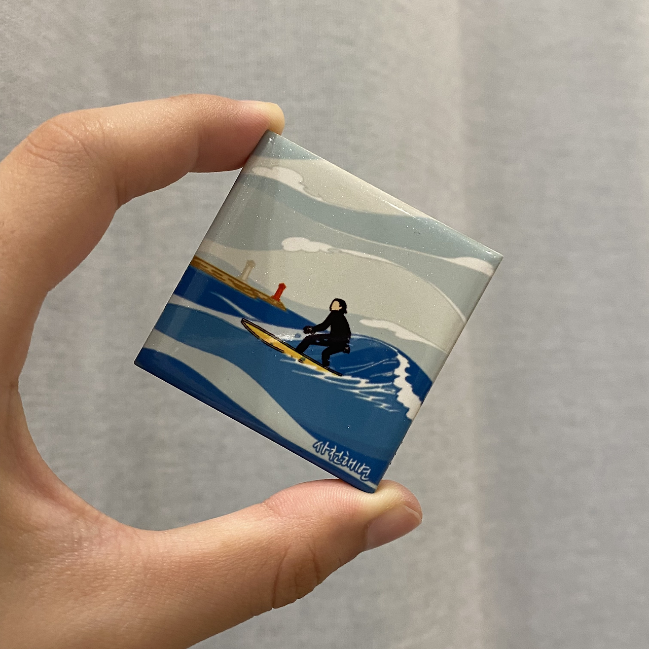 고래책방에서 구매했던 작은 마그넷을 펼쳐본다. 평소라면 마그넷 같은 건 정말 안 사는데 왠지 이번만큼은 사고 싶어졌다. 코어힘으로 중심을 잡고 파도를 타는 저 서퍼의 열의가 마치 나의 코어에 힘을 주는 것 같았다.