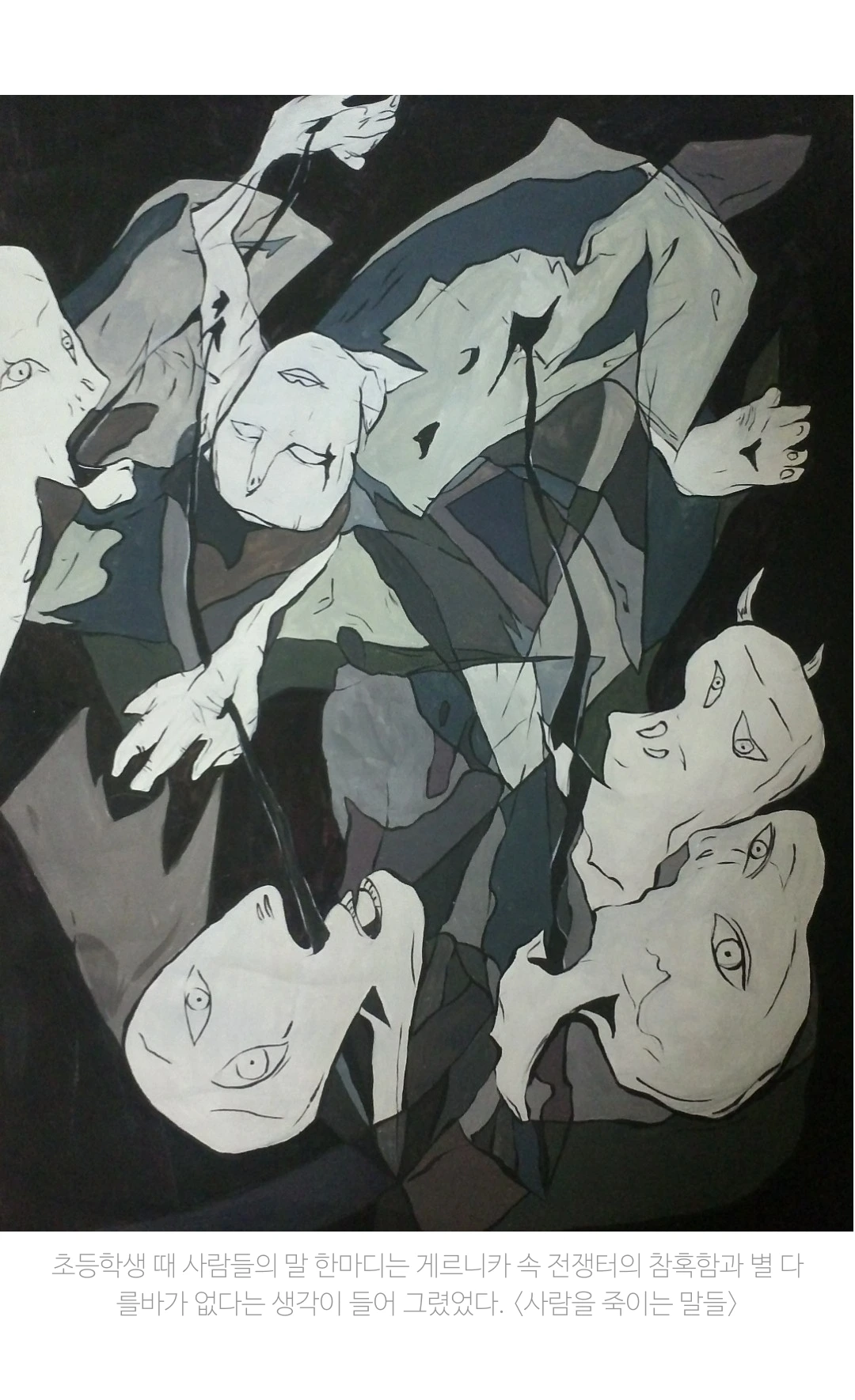 내가 무심코 뱉고 가볍게 비난했던 말 한마디가 사람을 죽이는 말이 될 수 있단 걸 사람들은 모르는 것 같았어요. 저는 말이 너무 무게감이 있었고 눈으로 보이는 전쟁보다 더 지독하고 악독한 것이 말 한마디라는 생각이 들었어요.