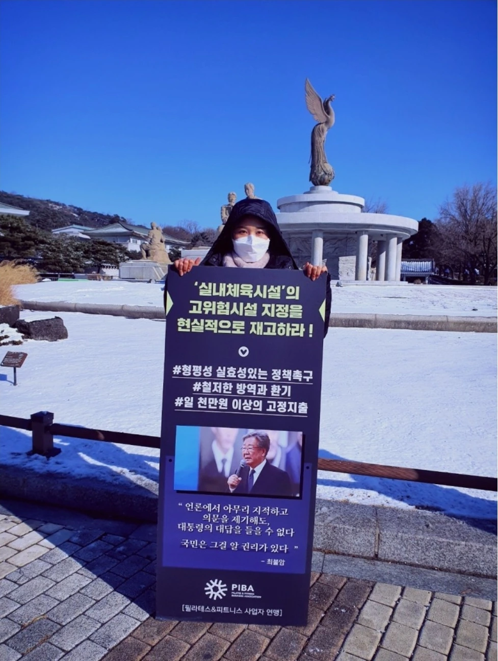 코로나로 인한 정부의 규제, 시스템적인 문제를 바꾸겠다며 피트니스 연대와 함께 국회 의사당 앞에 찾아가 정부가 내린 방역 수칙을 지키며 조용한 1인 시위에 동참했어요.