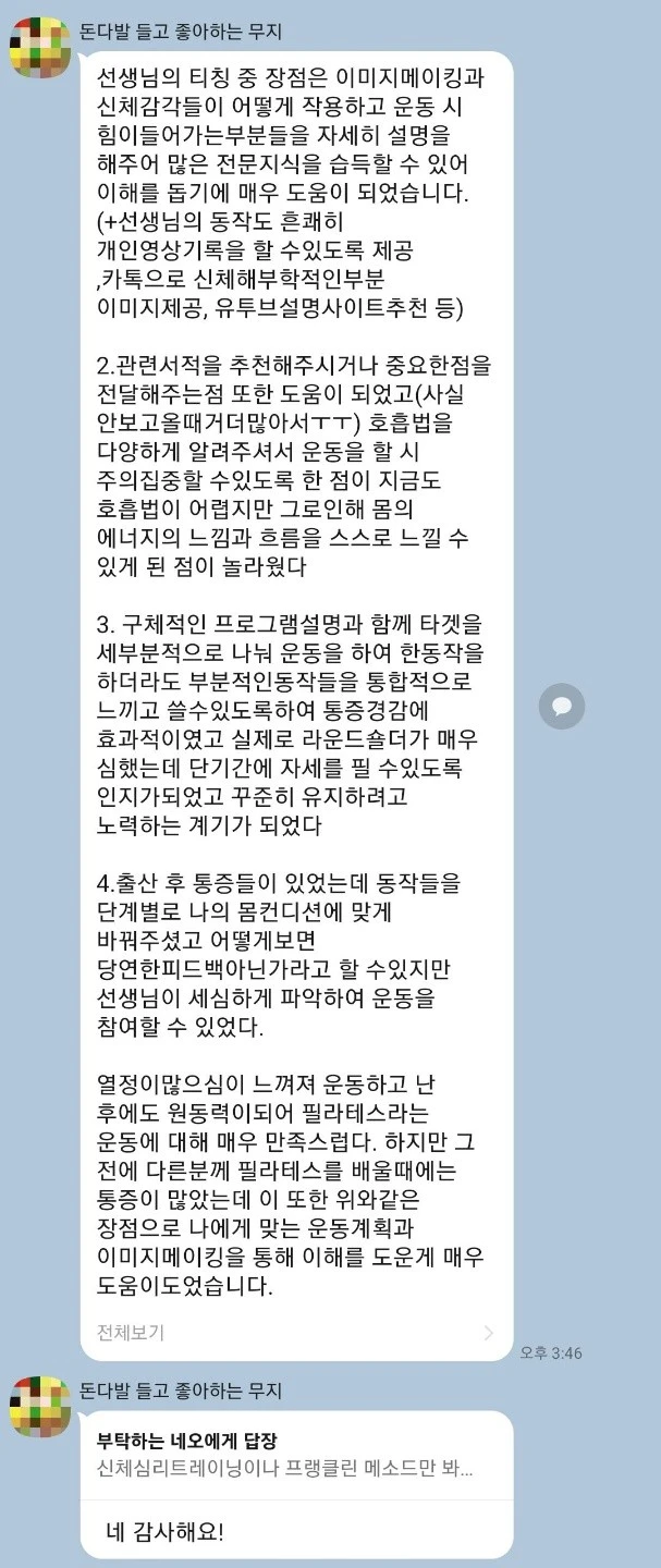 나 혼자 잘 사는 것 만으로는 행복하지 않아요. 주변이 아프면 그 감정에 동화되고 쉽게 물드는 탓에 내 마음속에 자리 잡힌 사람들이 모두 아프지 않고 건강한 삶을 살았으면 좋겠어요. 결국 내가 통증에 민감하고 예민하니 주변인의 아픔을 사회에 아픔을 쉽게 외면하기에는 방관자 같더라고요. 그래서 운동을 가르칠 때도 그냥 돈을 벌기 위해 대충 알려 주는 게 아니라 사람을 마음 중심에 두고 진심으로 운동을 지도하고 함께 행복했으면 좋겠다는 마음으로 지도했어요. 그러다 보니 나의 부족함을 채우고 항상 배우려고 노력하게 됐던 것 같아요.