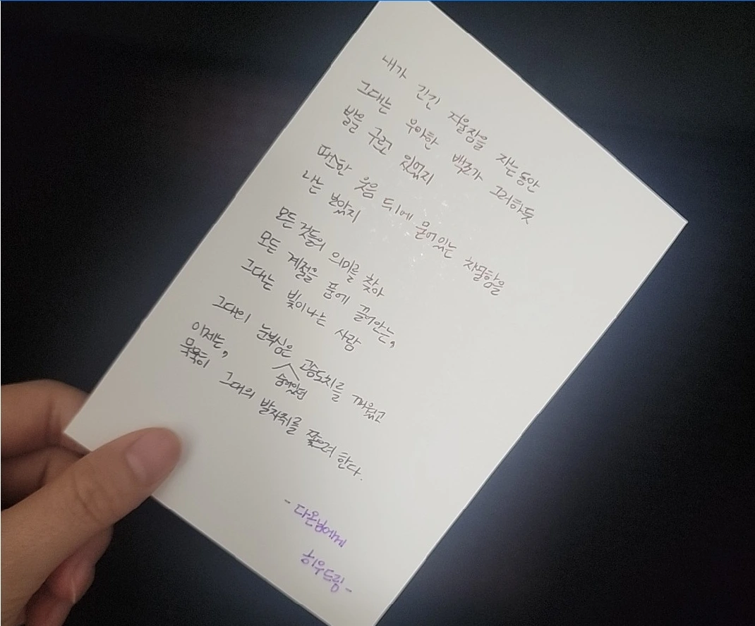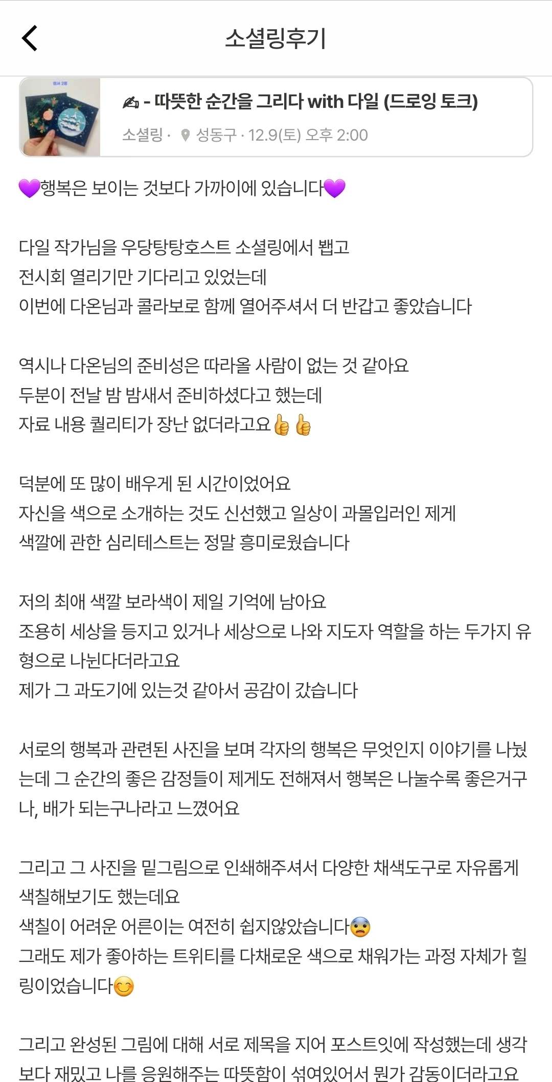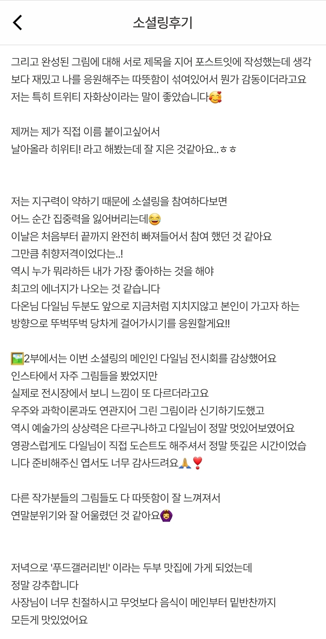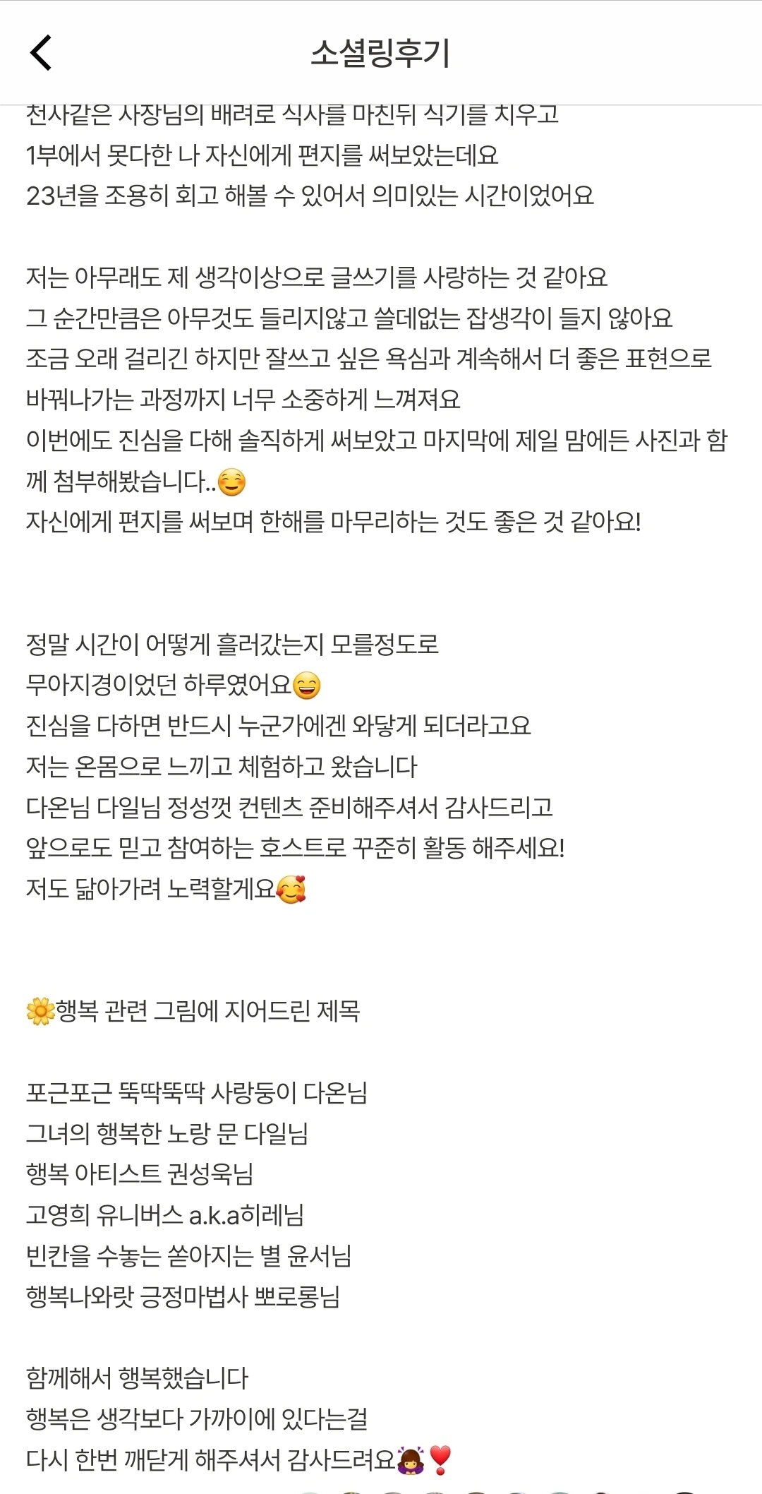 감사하단 후기덕분에 글쓰기가 쉽지 않고 힘들게 느껴져도 다시 도전하고 지속할 용기를 받게 됐어요. 내가 글을 받을 때도 감사했고 타인에게 써 드렸을 때 감사히 받아 주신 마음덕분에 행복했어요. 예쁜 후기와 말들은 울컥한 감동을 선물해 주는 것을느껴요.