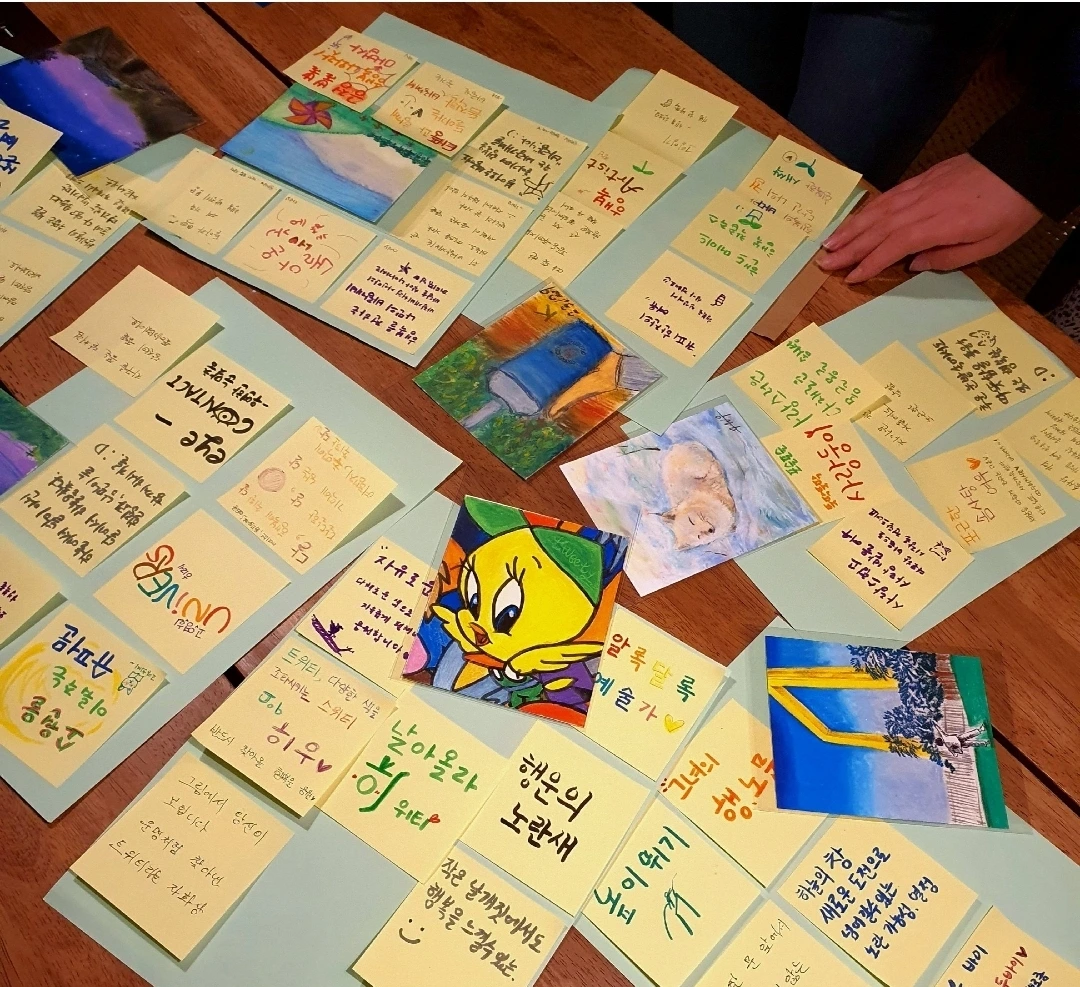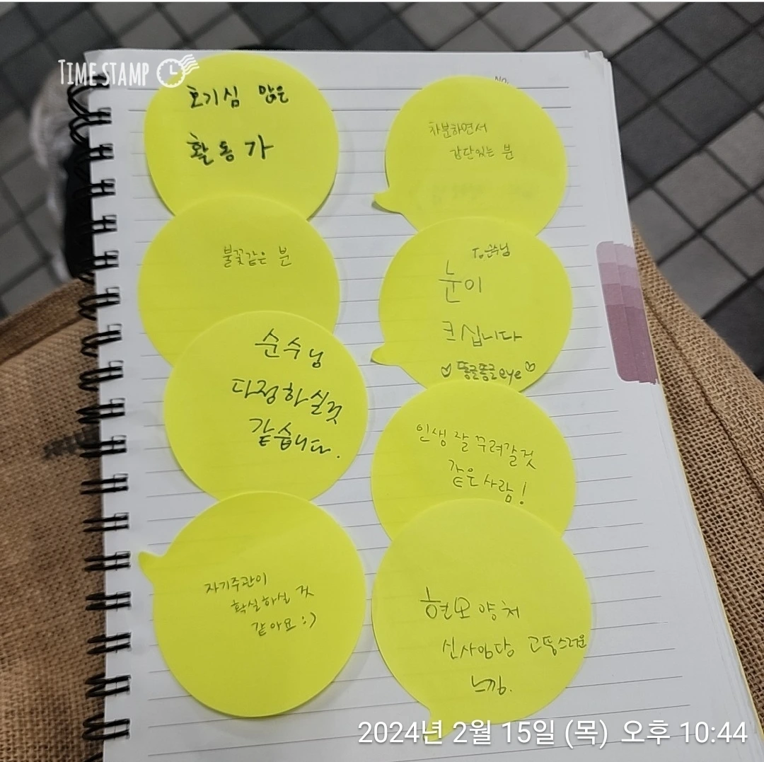 사람들의 첫인상을 포스트잇에 정성껏 적어 드렸었는데 제가 써드린 첫인상 글들을보고 신내림 받은 무당처럼 대부분 맞아 떨어졌다고하고 칭찬을 한트럭으로 받은 것 같았다며 인상깊은 포스트잇 2장을 뽑는데 7분 중 5분이 제가 써드린 글을 뽑아주시는신기한 경험을 하게 됐어요.