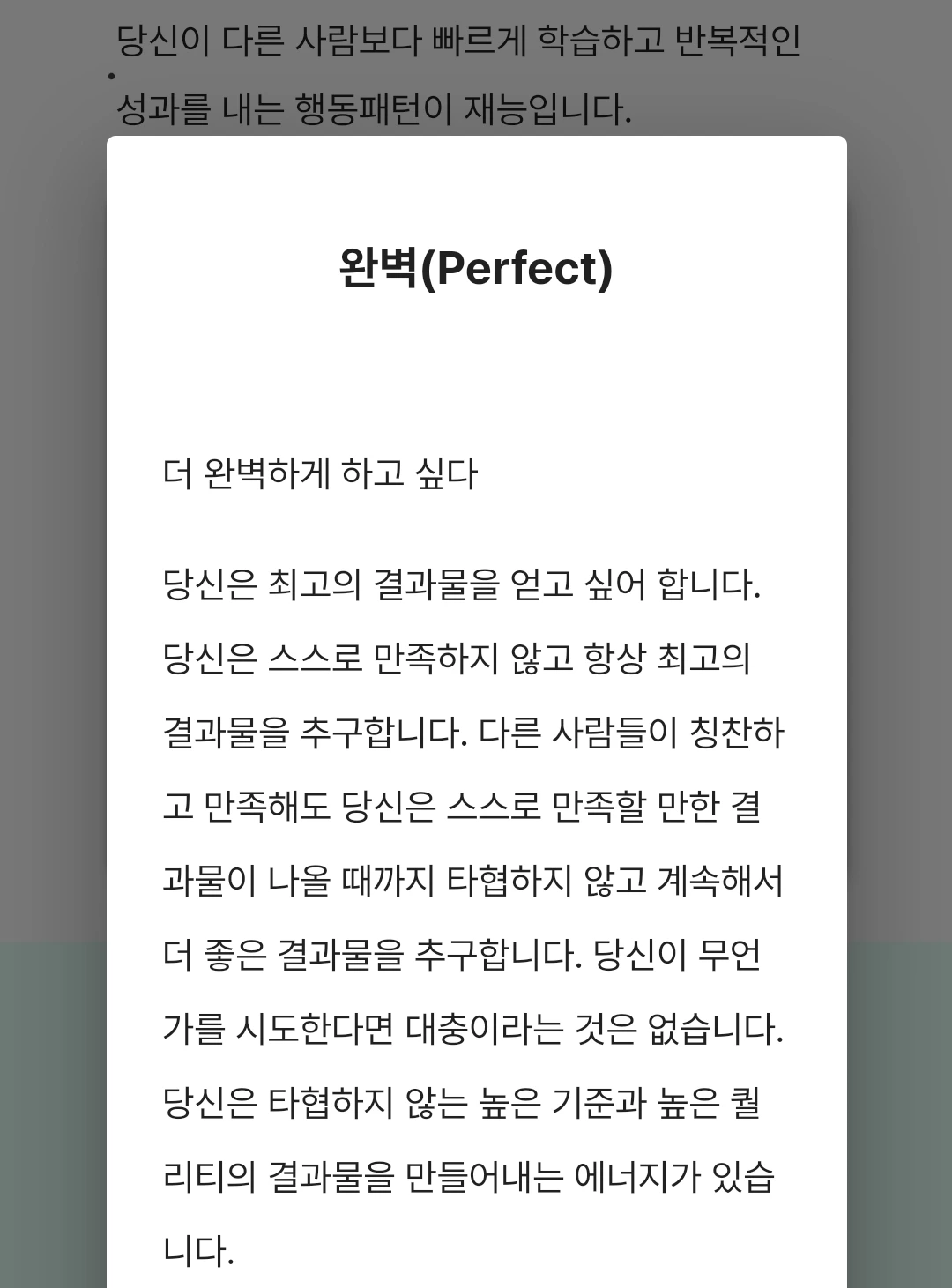 강점 검사인 태니지먼트 검사에 치어리더가나왔어요. 오프라인 모임에서 응원하고 동기 부여를 할 수 있는 말하는 능력이 강점이라고 하더라고요. 스스로 부족하다고 생각해서 완벽주의는영 아닌 것 같다고 생각했는데 완벽주의 성향이 나오고 자신감이 부족하다보니 세상에 드러내고 확신을 갖기까지 시간이 꽤 오래 걸리는 편이었어요.