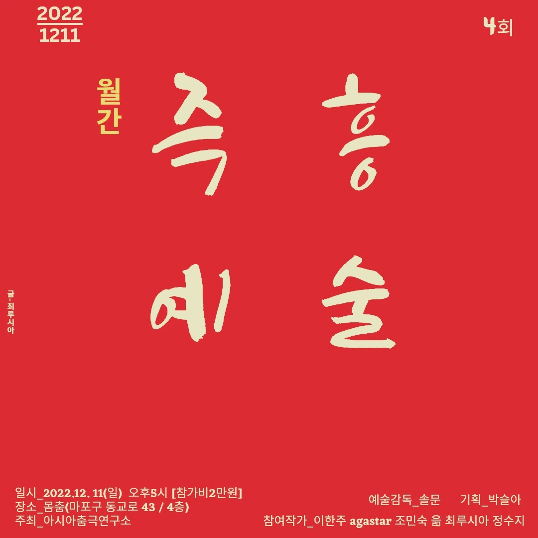 현실을 살아가다보니 답답해서 숨쉴 틈이 필요했다. 과거 웨이트쪽 제의를 해줬던 친구의 ‘돈때문에 오는게 아니잖아.’ 라는 한 마디에 많은 생각이 들었었다. '맞아. 원래 난 이렇게 살고 싶지 않았어. 진정성있게 가치있는 일을 하며 살고 싶었지. '조건이 바껴서 그곳에 가지는 않았지만 그 말 덕에 잊고 살았던 하고 싶은 일들을 생각하게 됐던 것 같다. 그래서 그 말이 꽤나 고마웠다. 덕분에 다시금 공연 무대에서의<즉흥예술>기획자로서제의에 순순히 응하며 열정 호구짓을 또 자처하게 됐던 것 같다.