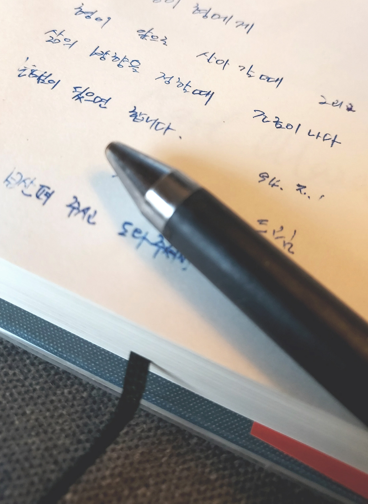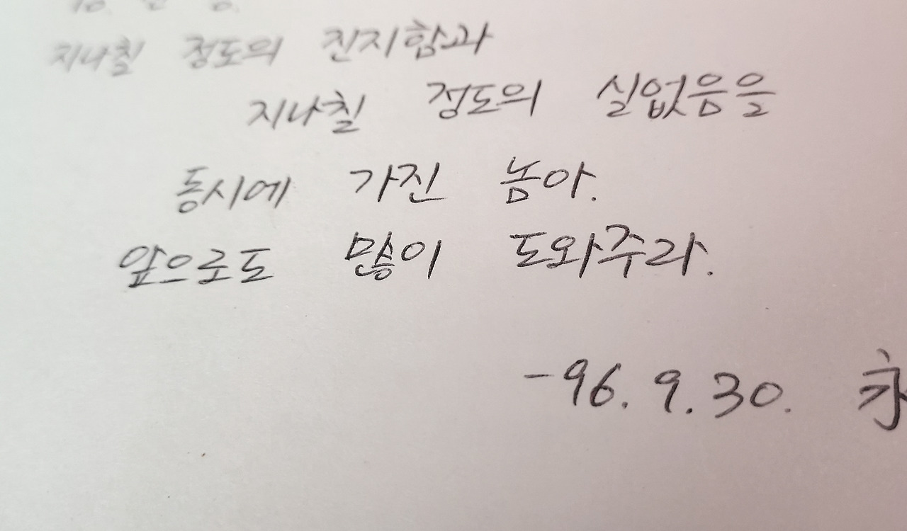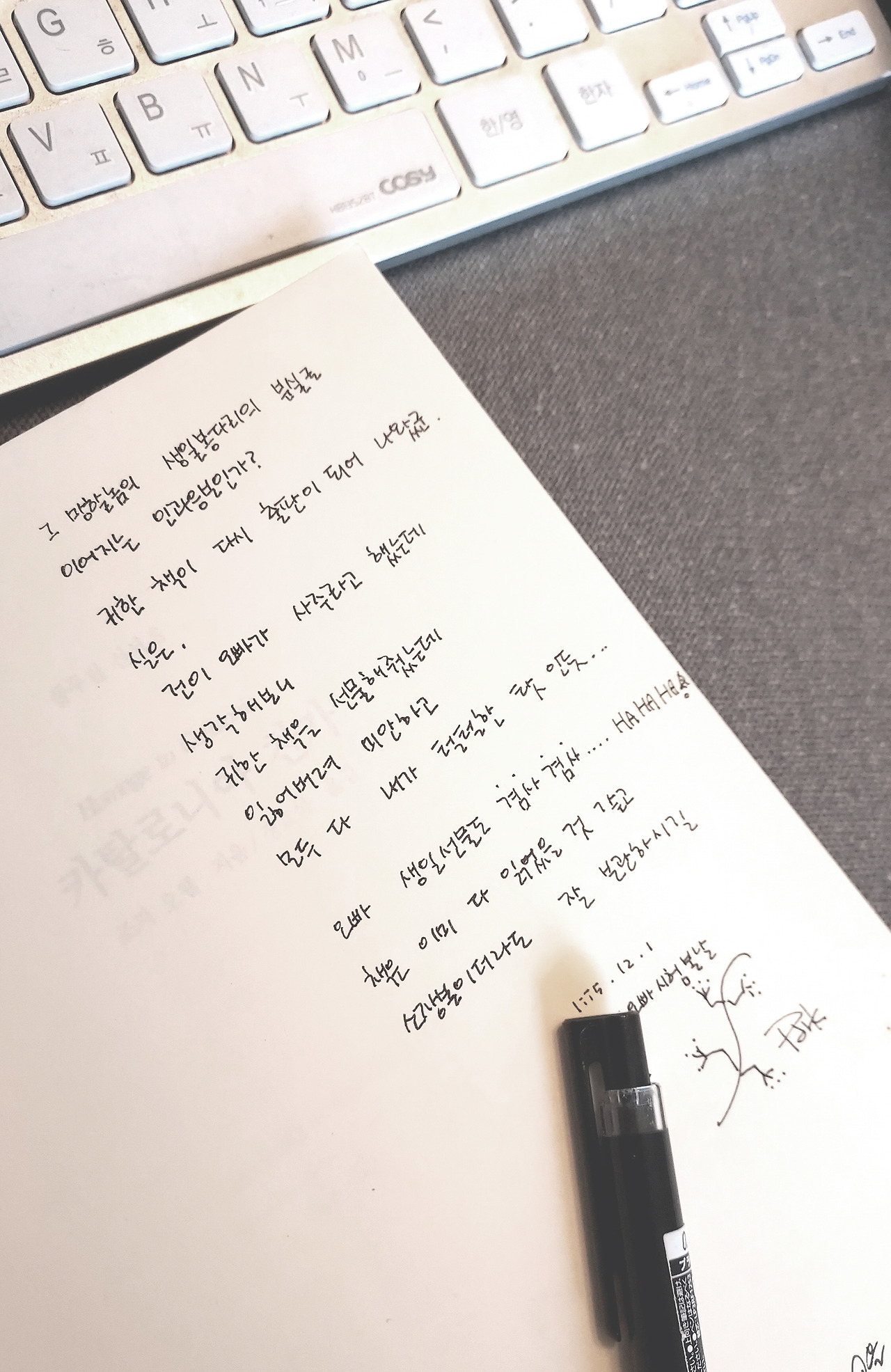 비판의 무기를 들기 전에 무기부터 비판하자던, 귀신이 씨나락 까먹다가 요강 들고 농구 하는 소리를 해대던 늘 성난 친구는 노동운동에 매진하며 연말에 후원금을 삥 뜯어가곤 합니다. 쓴 소주가 빠질 수 없던 시절, 핏대 선 삿대질을 해대며 서로에게 혹독한 짐을 선물하면서 그 짐만큼 또 뜨겁게 서로 기대하기도 했던 열정들의 분투도 구불구불한 글씨로 남아 빛을 내네요.