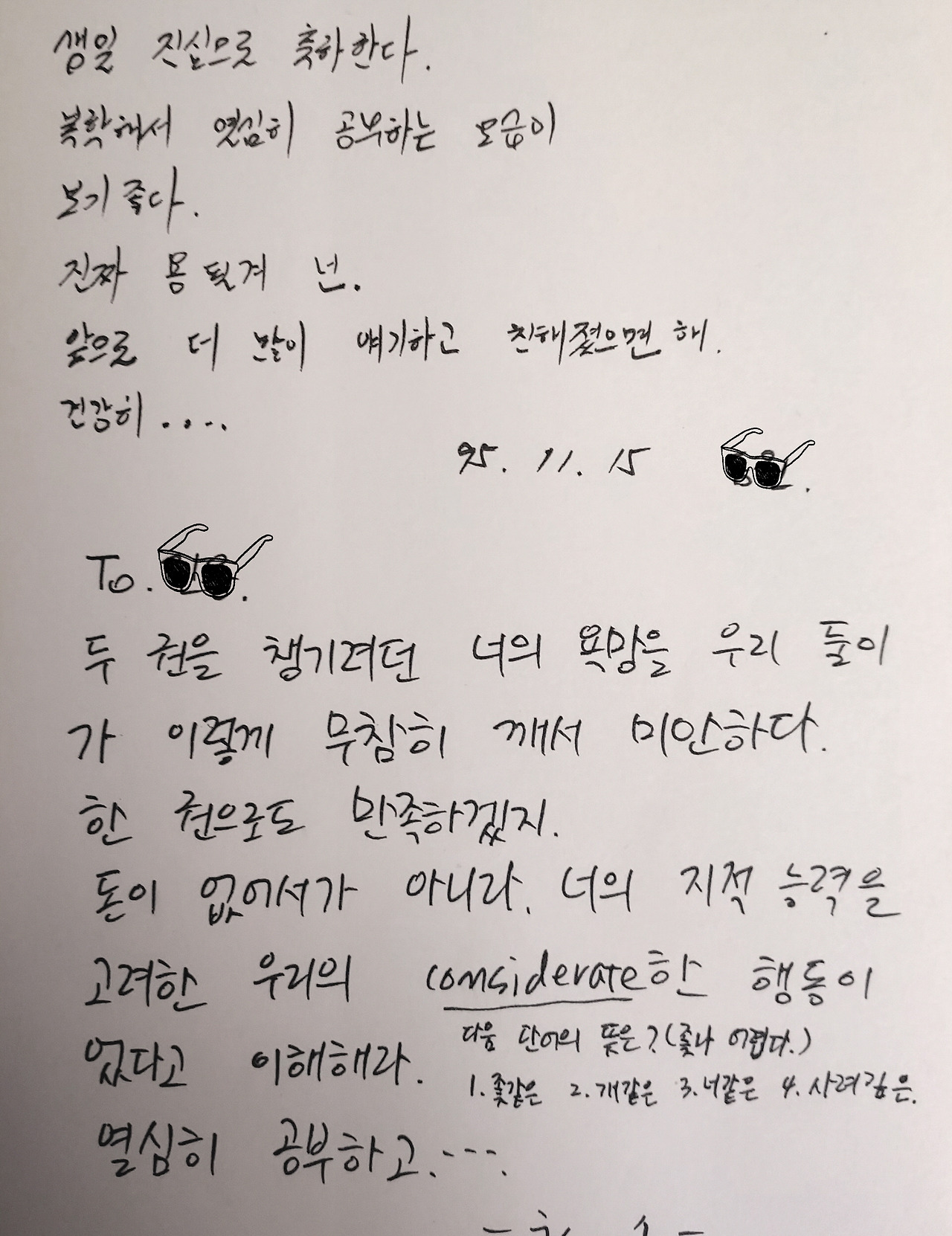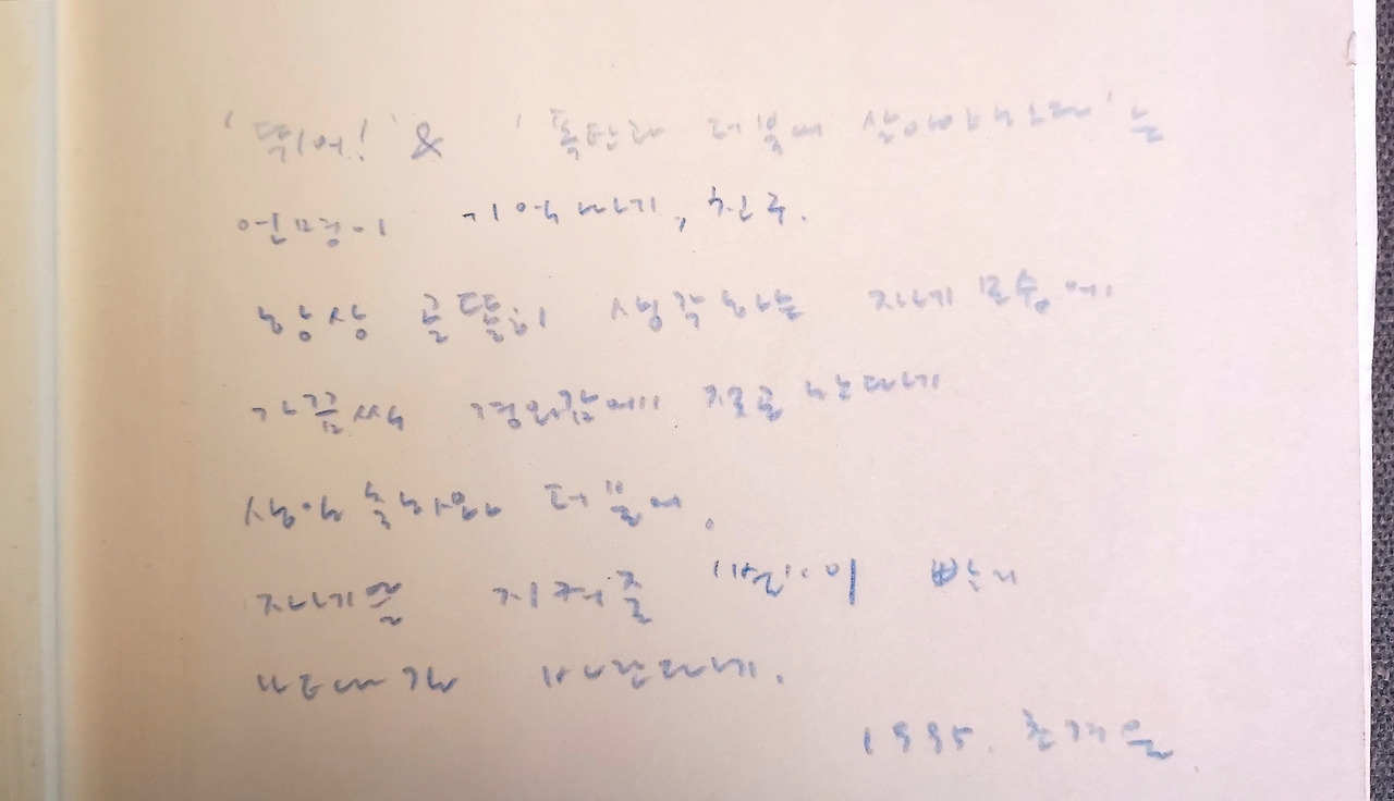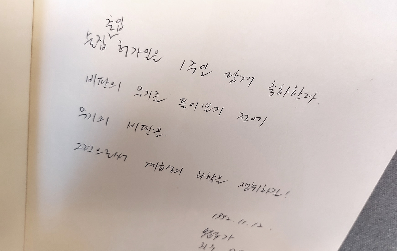 비판의 무기를 들기 전에 무기부터 비판하자던, 귀신이 씨나락 까먹다가 요강 들고 농구 하는 소리를 해대던 늘 성난 친구는 노동운동에 매진하며 연말에 후원금을 삥 뜯어가곤 합니다. 쓴 소주가 빠질 수 없던 시절, 핏대 선 삿대질을 해대며 서로에게 혹독한 짐을 선물하면서 그 짐만큼 또 뜨겁게 서로 기대하기도 했던 열정들의 분투도 구불구불한 글씨로 남아 빛을 내네요.