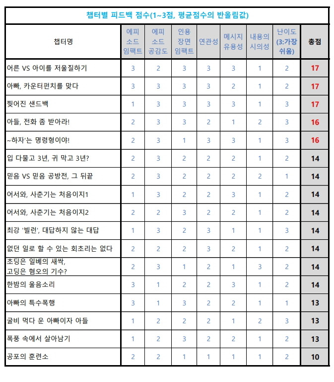 7가지 항목을 설정해 챕터별로 채점을 부탁했습니다. 1) 부자갈등 에피소드의 임팩트, 2) 에피소드 공감도, 3) 인용 장면의 임팩트, 4) 에피소드와 인용 장면 간 연관성, 5) 챕터별 핵심 메시지의 유용성, 6) 시의성, 7) 난이도.