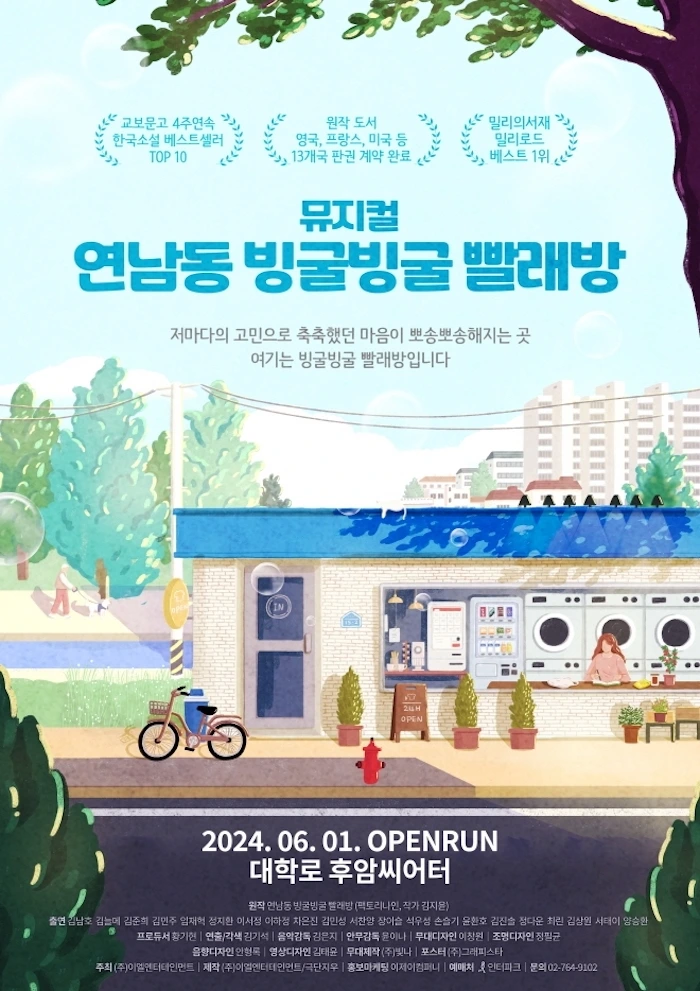 김지윤 작가의 장편소설 <연남동 빙굴빙굴 빨래방>은 따뜻한 이야기로 사람들에게 위안을 주며 밀리의 서재 베스트셀러 1위에 오르고, 인기에 힘입어 종이책을 출간했다. 그 이야기는 종이책을 넘어 아름다운 넘버와 함께 실시간으로 감동을 전달하는 뮤지컬로도 펼쳐지게 되었다.