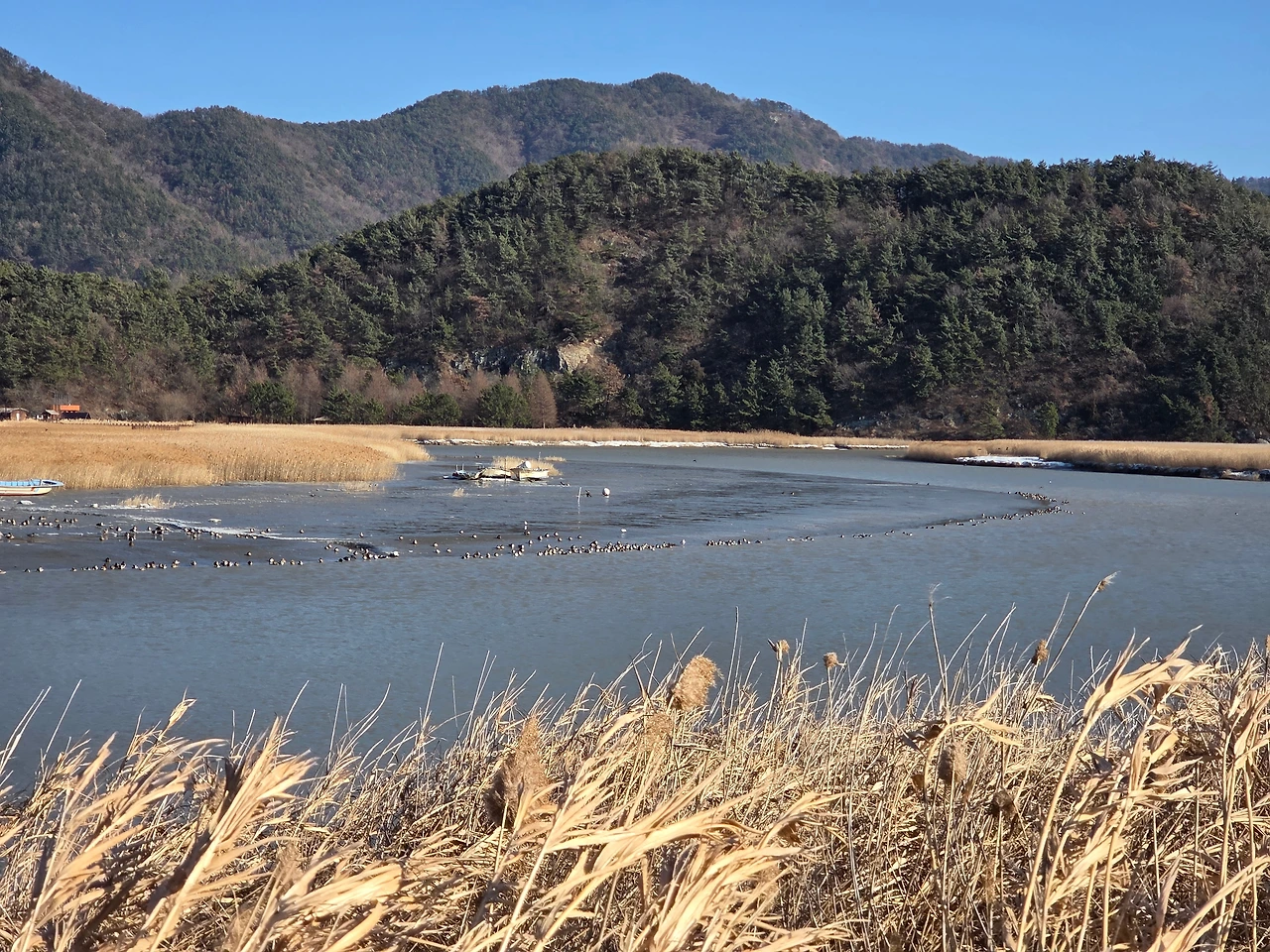 저 멀리 흑두루미가 보인다. 너무 멀리 있어 아쉽지만, 그래도 어떠한가. 오리들이 날아다닌다. 진영을 맞춰 날아다닌다. 신기하다. 저들은 어떻게 저런 진열을 맞추는 걸까. 여기까지 온 보람이 있다.