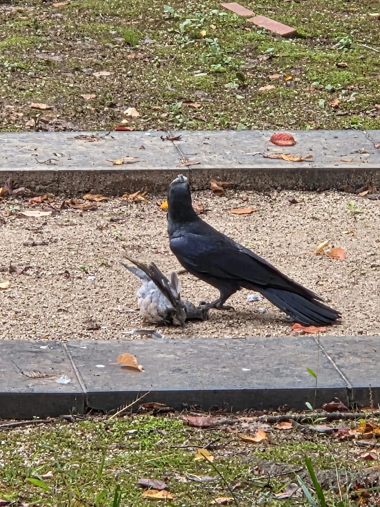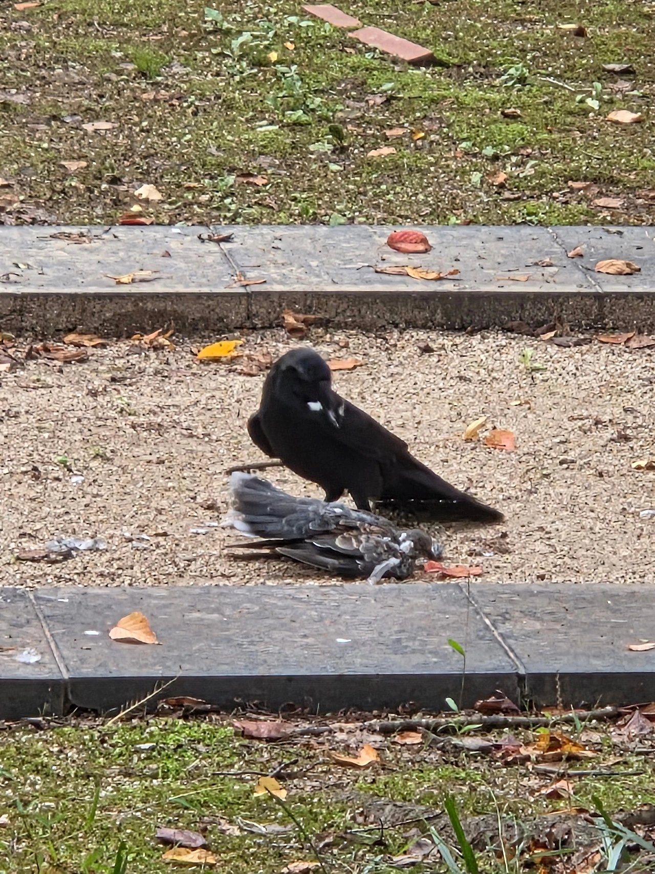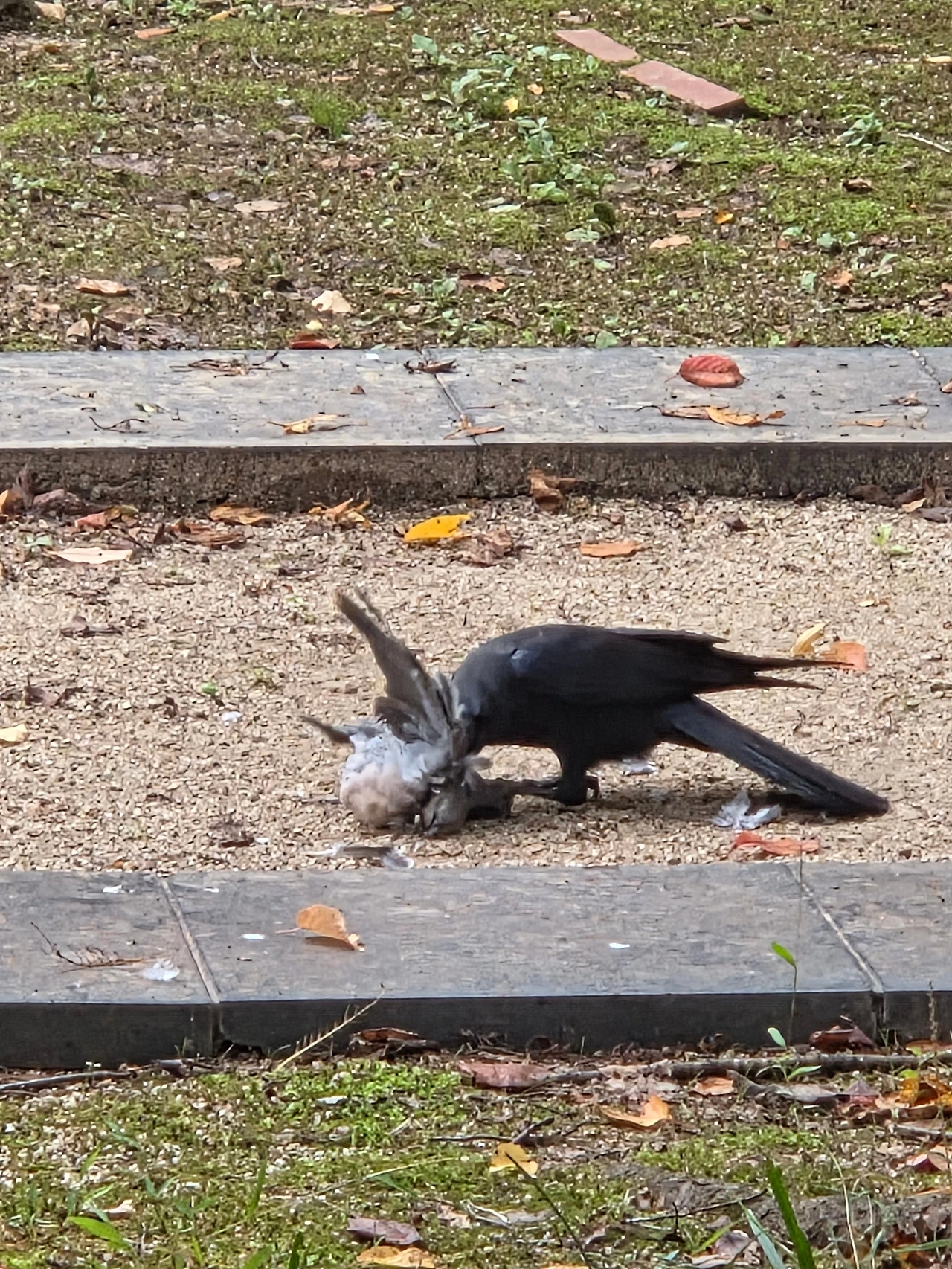 여느 때와 같이, 점심을 먹고 산책 중이었습니다. 까마귀의 사냥 장면을 봤습니다. 비둘기를 사냥하고 있었습니다. 까마귀가 사냥도 하는지 몰랐습니다. 신기한 마음에 사진을 찍었습니다.