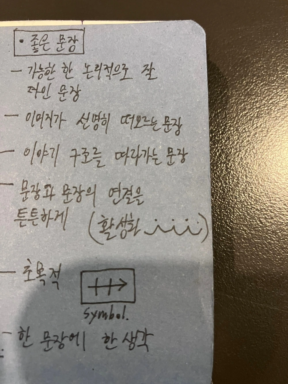 피부에 타투를 새기는 건 싫은데, 항상 잊고싶지 않은 것들이 있을때 내가 깨닳은 가장 좋은 방법이 있다. 비가 오나 눈이 내리나 바지 주머니에 수첩을 넣고 다니는 것이다.(타투와 메모는 결이 상당히 다르지만) 그리고, 툭 하면 펼쳐지기 쉽상인 수첩의 맨 앞 종이에 아끼는 규율들을 적어둔다.