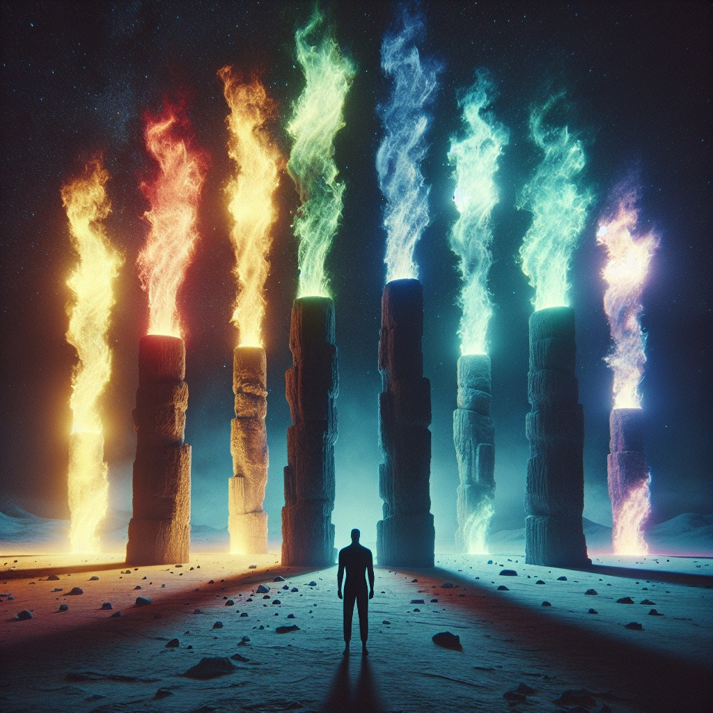 식별할 만큼 가까운 곳에 이르자, 나는 그 압도적 광경에 넋을 잃고 말았다. 파르테논 신전의 그것 만큼 커다란 기둥 여섯 개가 불타오르고 있었던 것이다. 타오르는 화염은 멀리서 볼 때와는 달리 단순한 붉은 빛깔이 아니었다. 각 기둥이 각기 다른 색으로 불타고 있었다.