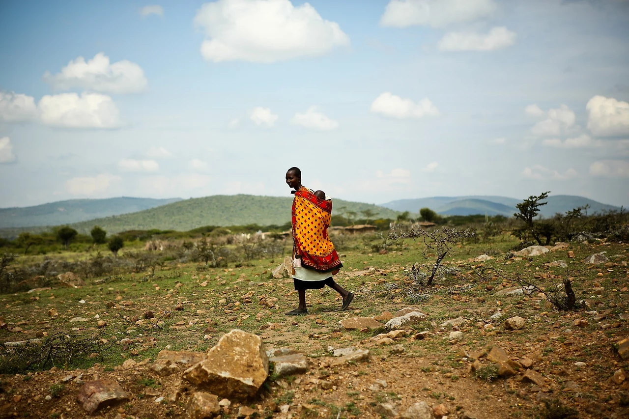 아기를 업고가는 엄마