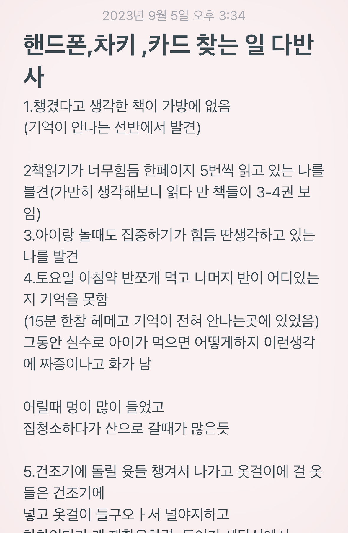 나는 그동안 나의 사건 사고들을 기록했다.(몇 번 이따 써야지 하다가 이 또한 까먹기 시작해서 실수가 생기면 바로 오탈자 신경 안 쓰고 써내기 시작했다. 메모를 안 하니 내가 실수했던 것들이 많았던 거 같은데… 기억하려고 하니 무슨 실수를 했는지 생각이 전혀 나지 않았다.)