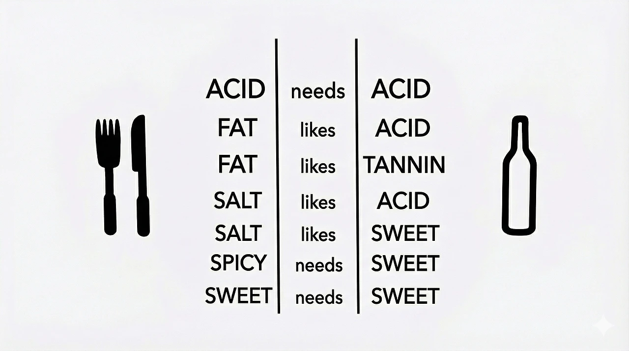 소금기 가득한 굴(Salt)에는 짠맛을 중화시키는 산도 높은 샴페인(Acid)이 맞고, 느끼한 튀김(Fat)에는 그 기름을 씻어줄 스파클링이나 타닌 있는 레드가 맞다.
