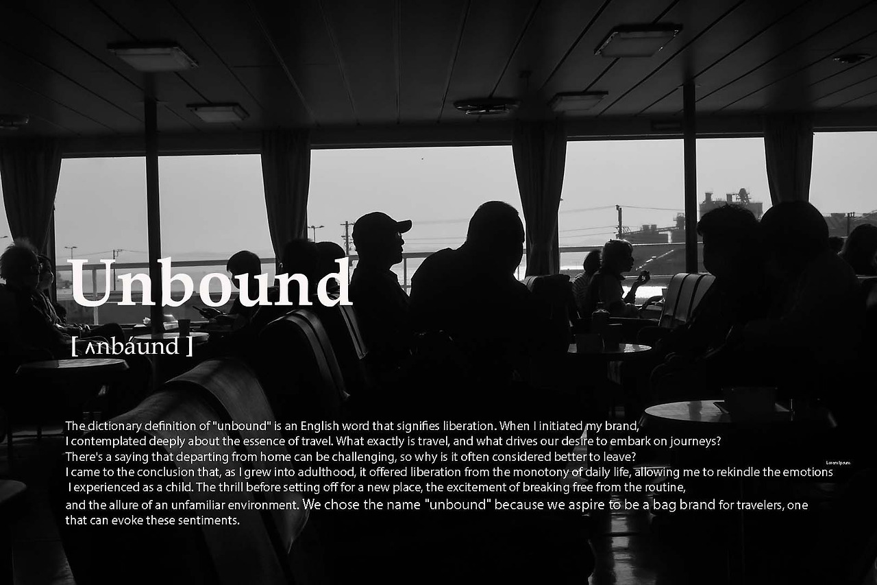 "Unbound(언바운드)"는 사전적 의미로 "해방되다"라는 의미를 가진 영어단어예요. 브랜드를 시작하면서 여행이란 무엇일까에 대해 많이 고민해 봤어요. 여행이란 무엇이며 우리는 왜 떠나려고 할까? 집 떠나면 개고생이라는 말도 있는데 왜 떠나는 게 좋았을까? 어른이 되면서 쳇바퀴처럼 돌아가는 삶 속에서 해방되어 어렸을 적 느꼈던 즐거운 감정을 다시 느낄 수 있었기 때문이라고 생각했어요. 어딘가로 떠나기 전에 설렘, 일상 속에서 벗어나 낯선 곳에서의 두근거림. 이러한 여행자의 감정을 표현하는 데 있어 가장 적합한 이름이라고 생각되어 선택하게 되었습니다.