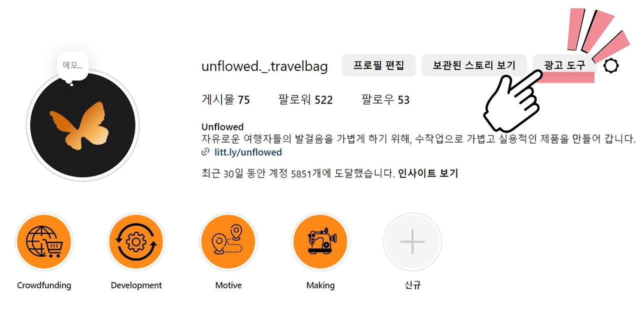 그래서 저희는 무리한 마케팅 대신, 저희 인스타그램, 블로그, 그리고 와디즈 팔로워분들에게 집중하기로 했습니다. 글을 쓰고 동영상을 만들고 스토리에 올려 저희가 말하고 싶은 이야기를 세상에 알리는 방법이죠. 그렇지만 이것만으로는 효과가 작다 보니, 인스타그램 광고도 고려하게 되었습니다. 인스타그램 광고가 좋은 점이 하루에 1$(대략 1300원)의 돈만으로 온라인 공간에서 광고가 가능하기에 본의의 주머니 사정에 따라 얼마든지 유동적으로 광고가 가능합니다.