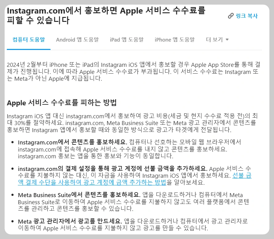 그런데 이번 아이폰에서 광고를 집행하려고 하니 뭔가 제가 설정했던 비용보다 비싸다는 느낌이 있었습니다. 계산내역을 보니 ‘애플 수수료’라는 항목이 추가된 것을 발견했습니다. 어플을 다운로드하는 것도 아닌데 왜 수수료가 부과되지?라는 생각이 들어 찾아본 결과, 올해 2024년 2월부터 인스타그램 광고에 대한 애플 서비스 수수료가 부과된다고 합니다.
