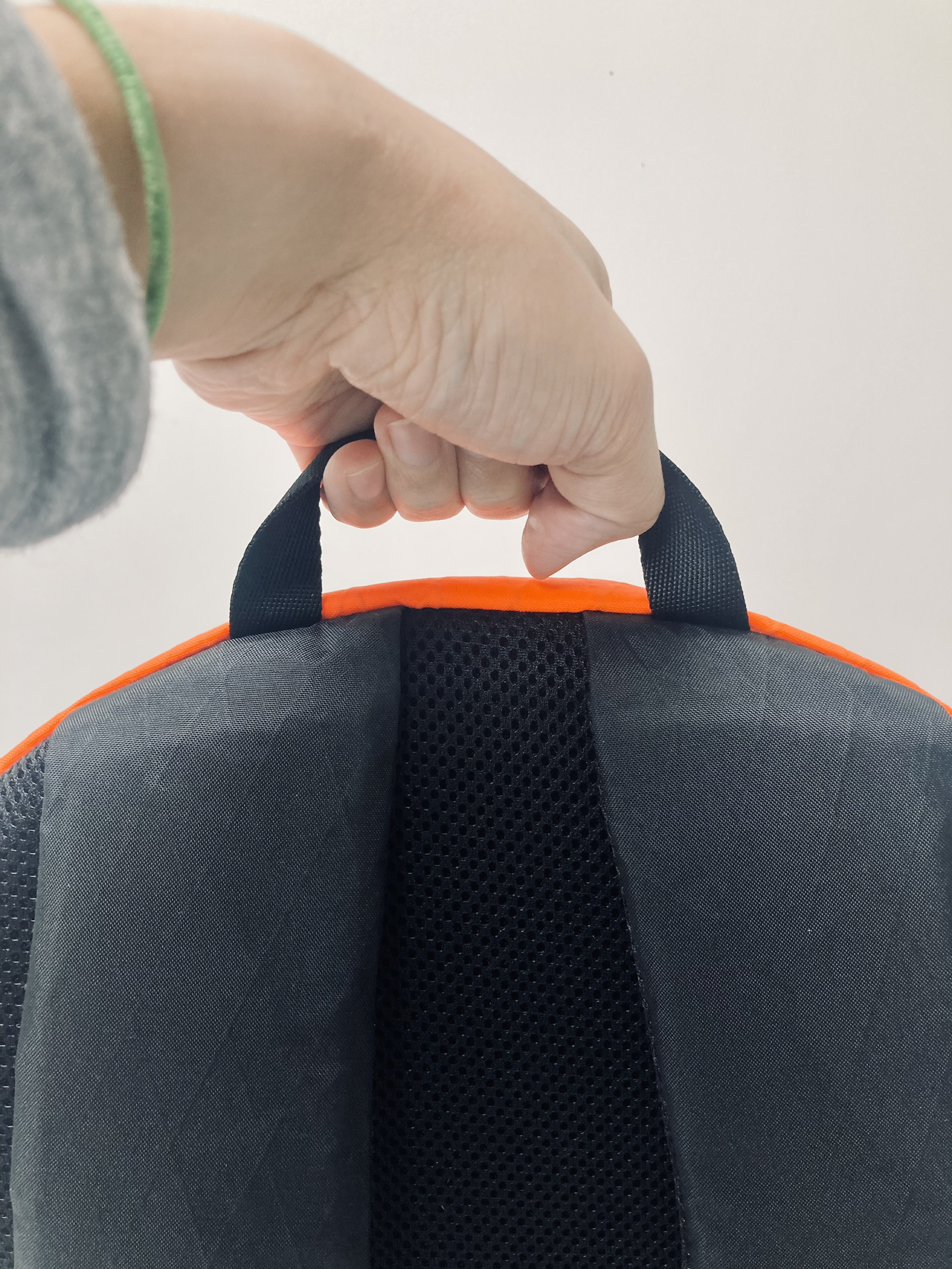 미타카백은 1박 2일의 가벼운 여행이나 일상에서 적합한 20L 크기로 제작되었습니다. 그렇기에 약 10kg 이하의 짐을 수납하기에 알맞은 사이즈로 실용성을 고려해 디자인되었습니다. 특히 가방 윗부분의 핸들은 기능적인 요소에 초점을 맞춰, 일상에서 화장실 이용하거나 등산 중 나뭇가지에 걸 수 있는 콤팩트한 사이즈로 제작되었습니다. 또한, 가방을 착용했을 때 뒷모습의 둥근 형태가 핸들로 인해 방해받지 않도록 세심하게 고려하였습니다.