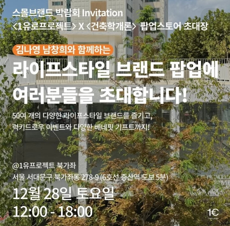 특히 이번 팝업은 [1유로 프로젝트]와 [건축학개론]이 함께하여 다양한 이야기를 만들 예정입니다.