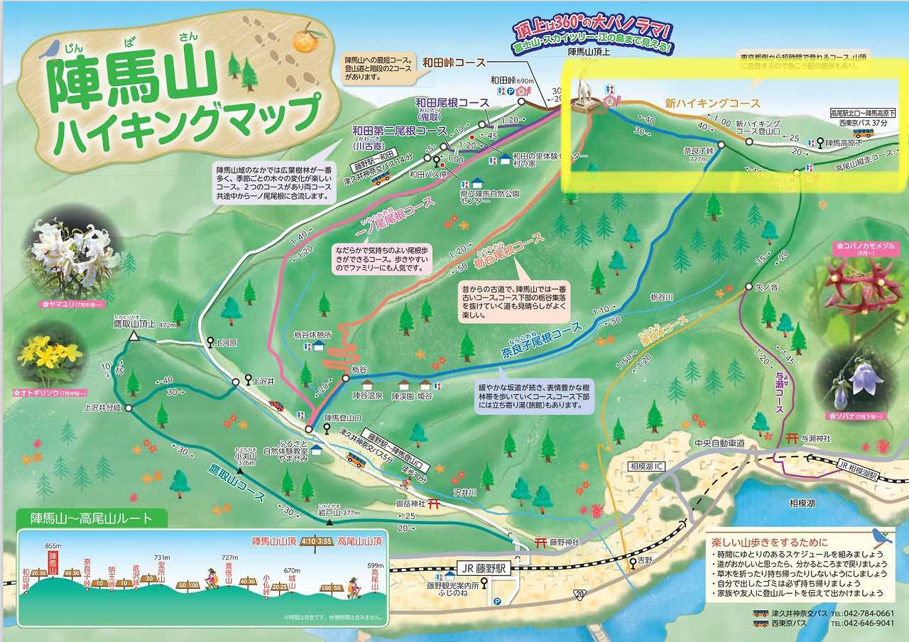 등산 코스로는 이번에도 카케노부야마와 같이 진바산부터 시작해서 타카오산으로 끝나는 코스를 추천드립니다. 진바산 역시 지역은 도쿄이지만 외곽지역이기에 버스가 늦게까지 없고 시간을 맞추기가 어렵다는 단점이 있어 타카오에서 전철을 타고 집으로 돌아가는 것이 좋습니다. 진바산을 오르는 코스로는 4가지가 있는지만 도쿄에서 가실 때에는 사진에 표시한 "노란색 네모박스의 코스"를 추천드립니다. 타카오역에서 32번 버스를 타고 진바산버스정류장에 도착하여 10분 정도 걸으면 등산 입구가 보입니다. 입구에서 1시간 정도면 정상에 도착하므로 지금까지 소개한 산을 전부 경험한 분이시라면 충분히 등반하실 수 있습니다.