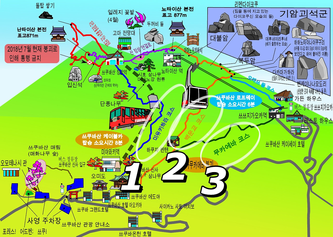 : 이 코스는 거리 2.7km의 최장 코스입니다. 뇨타이 산의 꼭대기로 이어지는 길에는 "벤케이 나나 모도리(弁慶七戻り)"나 "다카마가하라(高天原)"로 등 거대한 암석이 있어 쓰쿠바 산 특유의 자연을 만끽할 수 있습니다. 저는 이코스로 다녀왔는데 생각보다 나무의 잔뿌리가 길 중간중간에 돌출되어 있고 암석이 많아 어린아이와 같이 등반하실 분들은 주의하세요.