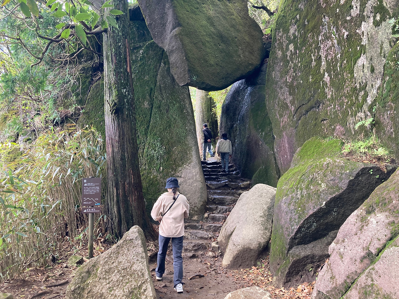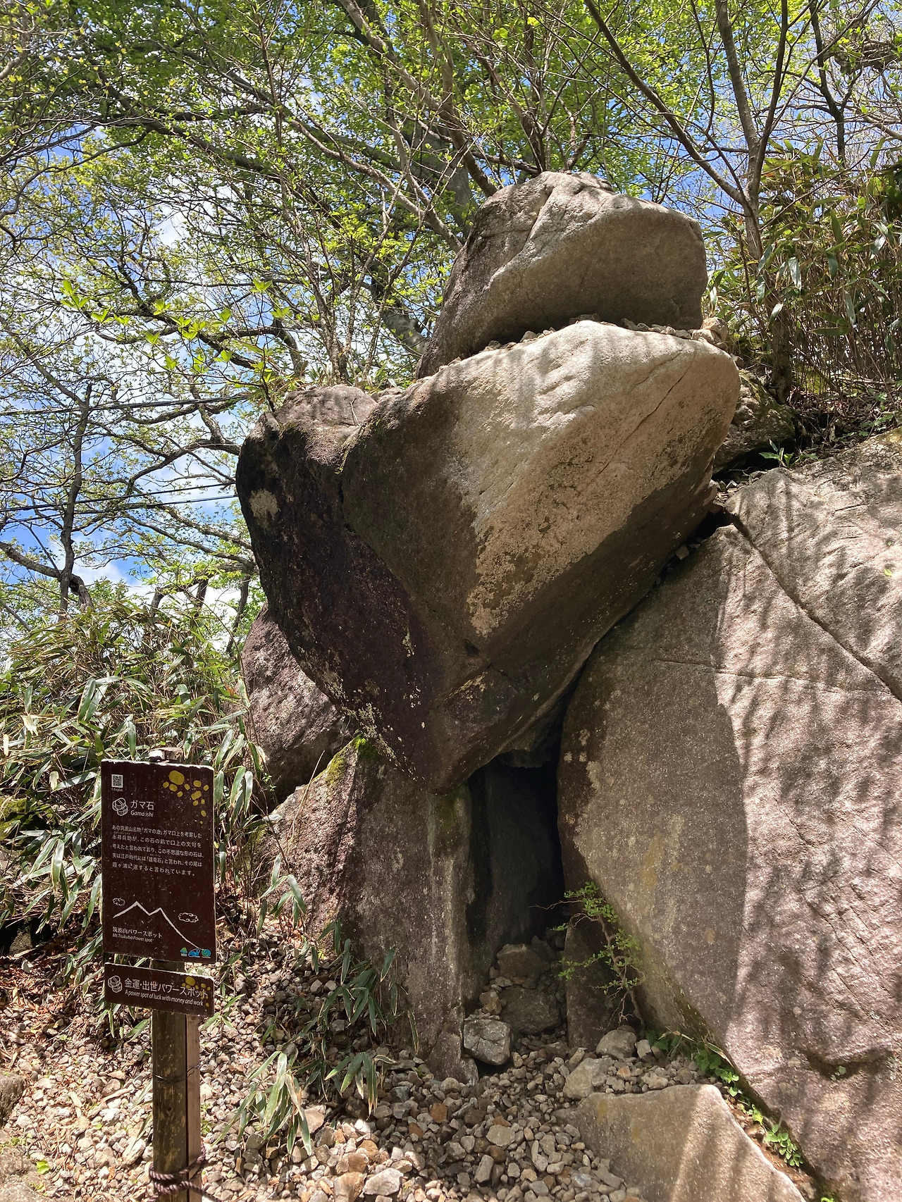 "가마이시“은 케이블카 승강장에서 뇨타이산 정상에 오르는 도중에 있습니다. 크고 작은 두 개의 바위가 겹쳐서 개구리 배처럼 보인다고 하지만 저는 잘 모르겠더라고요. 아무튼 이 바위는 사업, 장사에 성공이나 번성의 기운이 있다고 전해져 많은 관광객들이 방문하고 있다고 합니다.