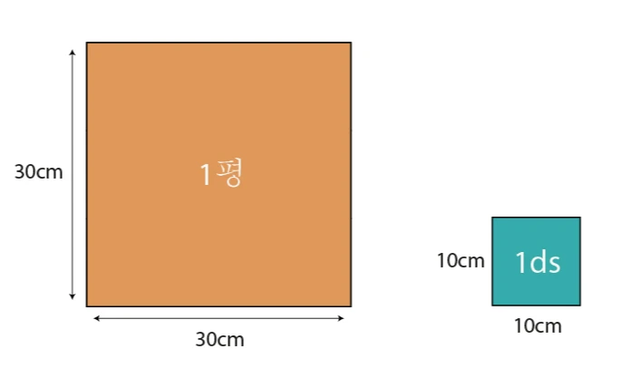 그럼 일본에서는 가죽단위를 어떻게 말할까요? 일본은 "데시"라는 단위를 사용합니다. 들어보신 적 있나요? 아마 못 들어보신 분들이 적다고 생각됩니다. 데시는 프랑스어로 단위를 세는 단위이며 일본어로는 "デシ"라고 쓰입니다. 1 데시를 "1ds"라고 표기하며 1ds는 가로·세로 = 10cm로 데시의 최소단위입니다.