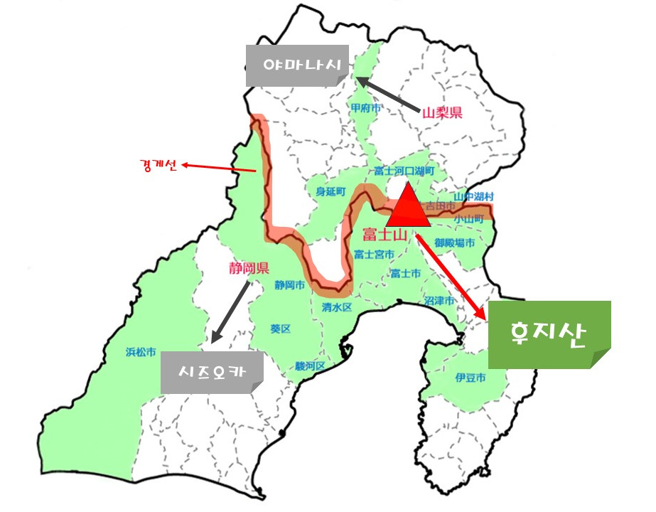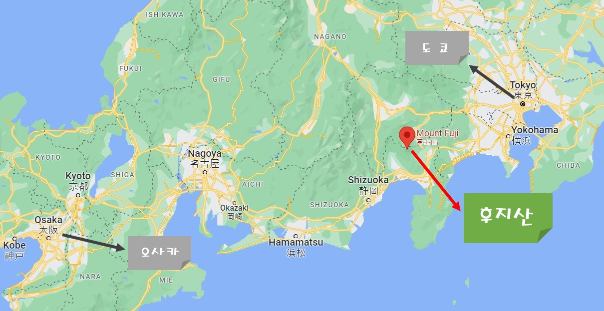 일본의 수도이자 도쿄에서부터 많은 분들이 관광으로 가시는 오사카 사이에 위치해 있습니다. 정확한 위치는 시즈오카현과 야마나시현 사이에 걸쳐있는데, 우리나라로 치면 충청남도와 충청북도 사이쯤이라고 생각하시면 좋을 것 같습니다.
