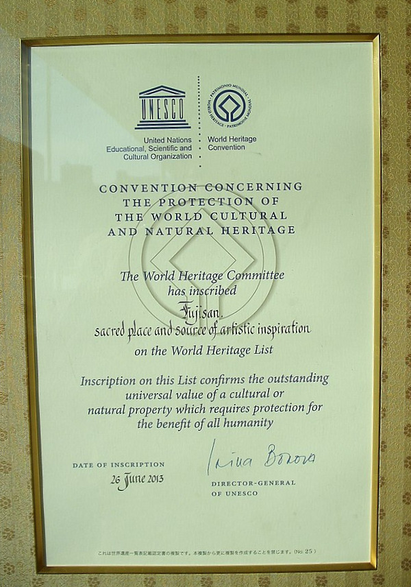 이렇듯 후지산은 자연스럽게 먼 옛날부터 일본인들에게 성스러운 곳으로 자리 잡게 되었고, 그 결과 후지산은 2013년 6월 26일에 유네스코가 지정한 세계유산에서 등재되었습니다. 여기서 특이한 점은 유네스코 등제 시에는 "문화유산", " 자연유산", "복합유산"으로 나누어져 있어 이 중 한 부분에 속하게 됩니다. 자연의 한 부분인 "산"이기에 자연유산이라고 생각하시는 분들도 많겠지만 일본사람들이 생각하는 후지산과 일본 문화에 다양한 영향 준 관점에서 후지산은 "문화유산"으로 등록되었습니다.