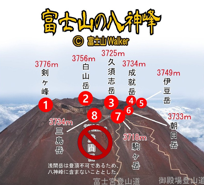 후지산 정상에 있는 8개의 봉우리를 총칭해서 "팔신봉"(八神峰/はっしんぽう)이라고 부르고 있으며, 불교에서 "8"이라는 숫자를 중요시하는 영향을 받아 "하치요"(八葉 / はちよう)라고도 불립니다. 그러나 사실은 세는 방법에 따라 9~13개 정도의 봉우리가 있지만 정확하게 어느 것을 봉우리가 하는지에 대한 것은 분명하지 않다고 합니다. 그리고 봉우리 전체를 한 바퀴 도는 것을 "오하치메구리(お鉢巡り)"라고 하며 1시간 30분 정도 소요됩니다.