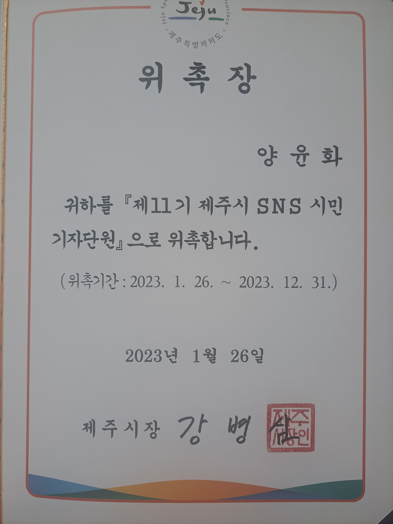 23년도 제11기 제주시 sns 시민 기자단 활동을 시작으로 많은 사람들에게 즐겁고 유익한 정보를 알려 주기 위해 다양한 활동을 할 것이다!