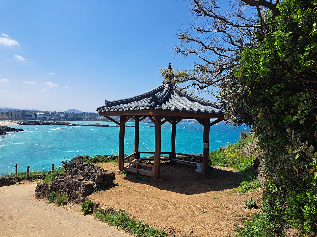 10여 분쯤 걸었을까. 작은 정자가 있는 휴식 공간에 다다라 잠시 발걸음을 멈췄다. 벤치에 앉아 숨을 고르며 풍경을 바라본다. 저 멀리 제주시가지가 한눈에 들어오고, 바다는 여전히 웅장한 소리로 자신의 존재를 알린다. 파도 소리는 귀에 들리기보다 몸으로 전해졌다. 바람에 실려 온 그 소리는 마음 깊은 곳까지 울림을 남겼다.