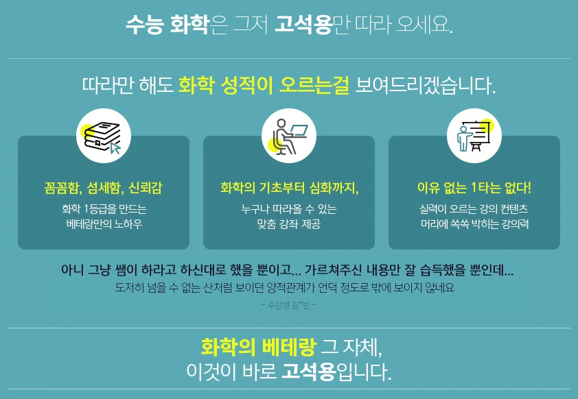 또한, 메가스터디는 강의 내용의 우수성과 학습 효과를 입증하는 다양한 성공 사례와 데이터를 지속적으로 제공함으로써 학습자의 확증편향을 자극한다. 예를 들어, 특정 강의를 수강한 학생들이 목표 대학에 합격한 사례나, 성적이 급상승한 후기 등을 반복적으로 노출하여, 학습자들이 메가스터디의 강의가 효과적이라는 신념을 더욱 강화하게 만든다. 이는 소비자가 자신의 선택을 정당화하고, 더 나아가 지속적으로 그 플랫폼을 이용하게 만드는 강력한 동기부여 요소로 작용한다.