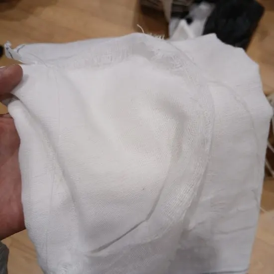 흰 천을 세로로 길게 반 접고, 다시 반 접는다.