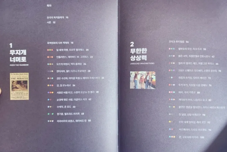 그렇다면 다른 영화들은 어떻게 소개되었을까? 이 책에는 모두 50편의 영화가 소개되었는데 내가 아는 영화라곤 고작 대여섯 편밖에 되지 않았다. 흑백영화 시대부터 코닥과 후지필름을 찍었던 영화는 거의 모르는 영화들이고 80년대 이후 영화 중에는 브래드 피트가 출연했던 〈세븐〉, 〈중경삼림〉, 〈박하사탕〉, 〈아멜리에〉, 〈라라랜드〉, 〈센과 치히로의 행방불명〉정도만 알고 있었다. 영화의 내용을 알고 이 책을 읽는다면 훨씬 흥미롭고 신기한 느낌을 줄 것 같다. 그래서 한 가지 아쉬운 점을 꼽자면 좀 더 대중적인 작품들을 소개했으면 좋았을 것 같다는 생각이 들었다. 이는 지극히 주관적인 생각이므로 평소 미적 감각이 뛰어난 사람이나 영화와 색채에 관심이 있었던 사람이라면 정말 재미있게 읽을 수 있는 책이다. 이 책은 글자가 매우 작은 데다 영화 관련 전문 단어들이 사용되었음에도 영화 자체가 주는 매력 때문인지 색채를 모르는 나조차도 흥미롭게 읽었기 때문이다.
