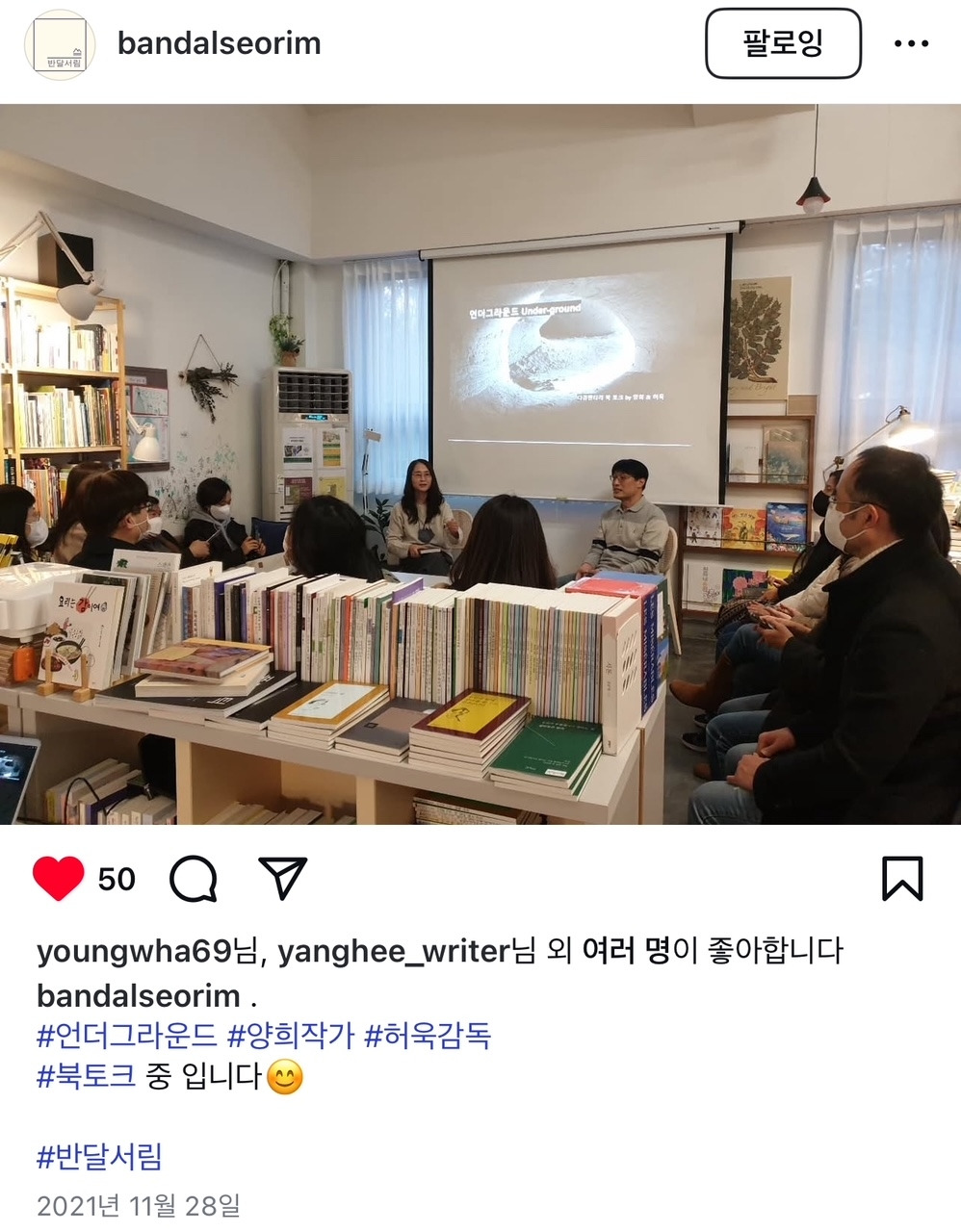 글의 처음에 밝혔듯이 양희 작가 또한 반달서림을 애정하는 동네주민이기에 『언더그라운드』의 첫 북토크를 반달서림에서 해야겠다고 생각했다고 한다. 그렇게 이루어진 『언더그라운드』의 첫 북토크는 양희 작가와 허욱 감독이 진행하고 영화 《언더그라운드》의 영상을 참고하며 책 이야기를 나누는 형태로 진행되었는데, 북토크 분위기가 사뭇 독특했다.