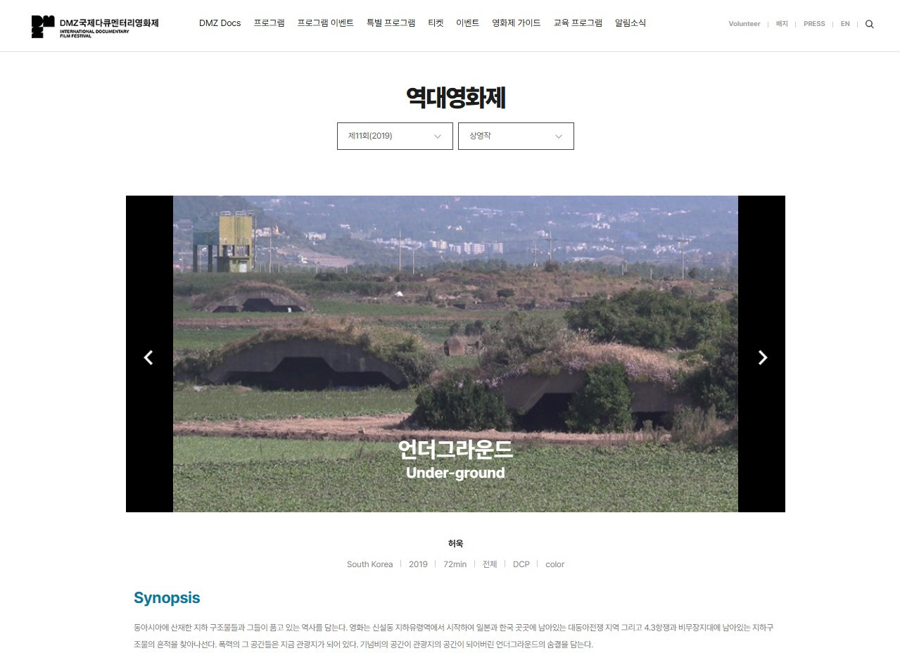 3. 제16회 DMZ 국제다큐멘터리영화제 (https://www.dmzdocs.com/kor/addon/00000002/history_film_view.asp?m_idx=102268&QueryYear=2019)